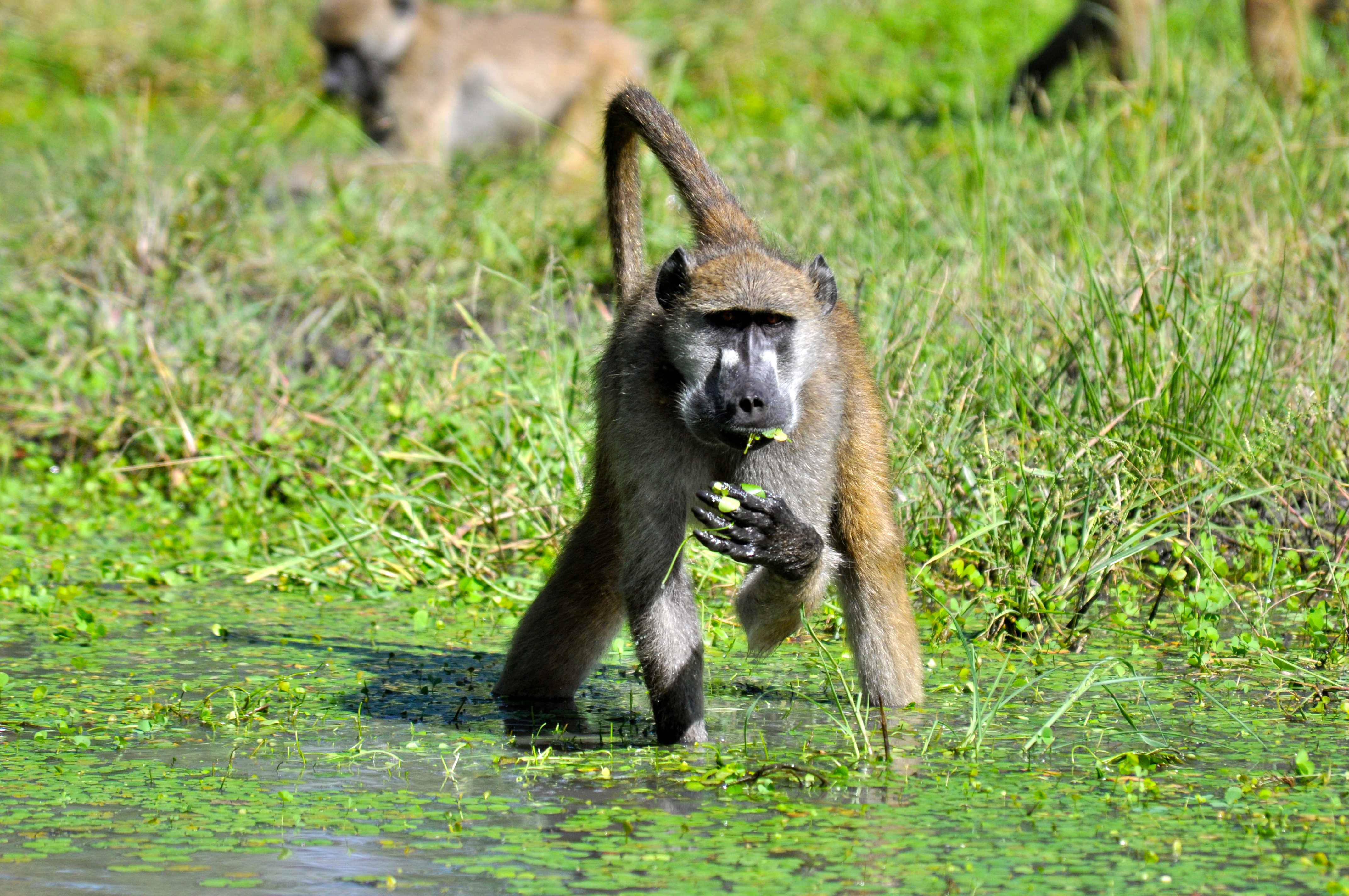 O show da manhã ficou por conta de um grande grupo de babuínos que se alimentavam na beira de uma lagoa. Os babuínos tomavam susto toda vez que apontávamos a câmara. Segundo Name, o nosso guia, os babuínos têm uma memória genética da época em que os caçadores ameaçavam violentamente essa região e confundem as câmaras com rifles.