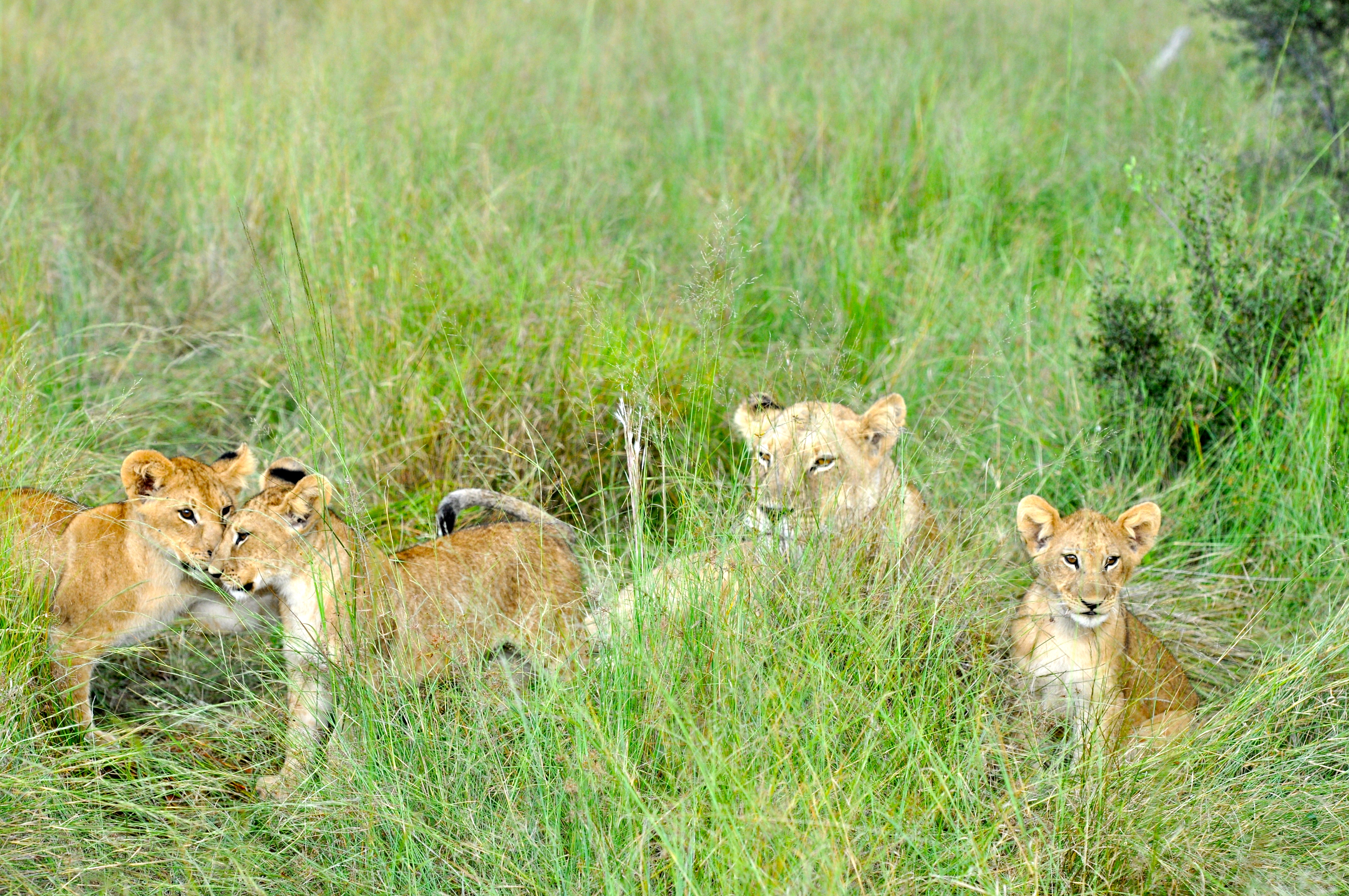 Saímos do hotel às 17h para mais um safari no Little Vumbura Camping. Nossa primeira parada importante foi para observar uma leoa e seus filhotes. A leoa era enorme com pelagem clara, quase branca, possuía três filhotes, possivelmente a mesma que vimos pela manhã. Estava deitada no capim brincando com a sua turma.