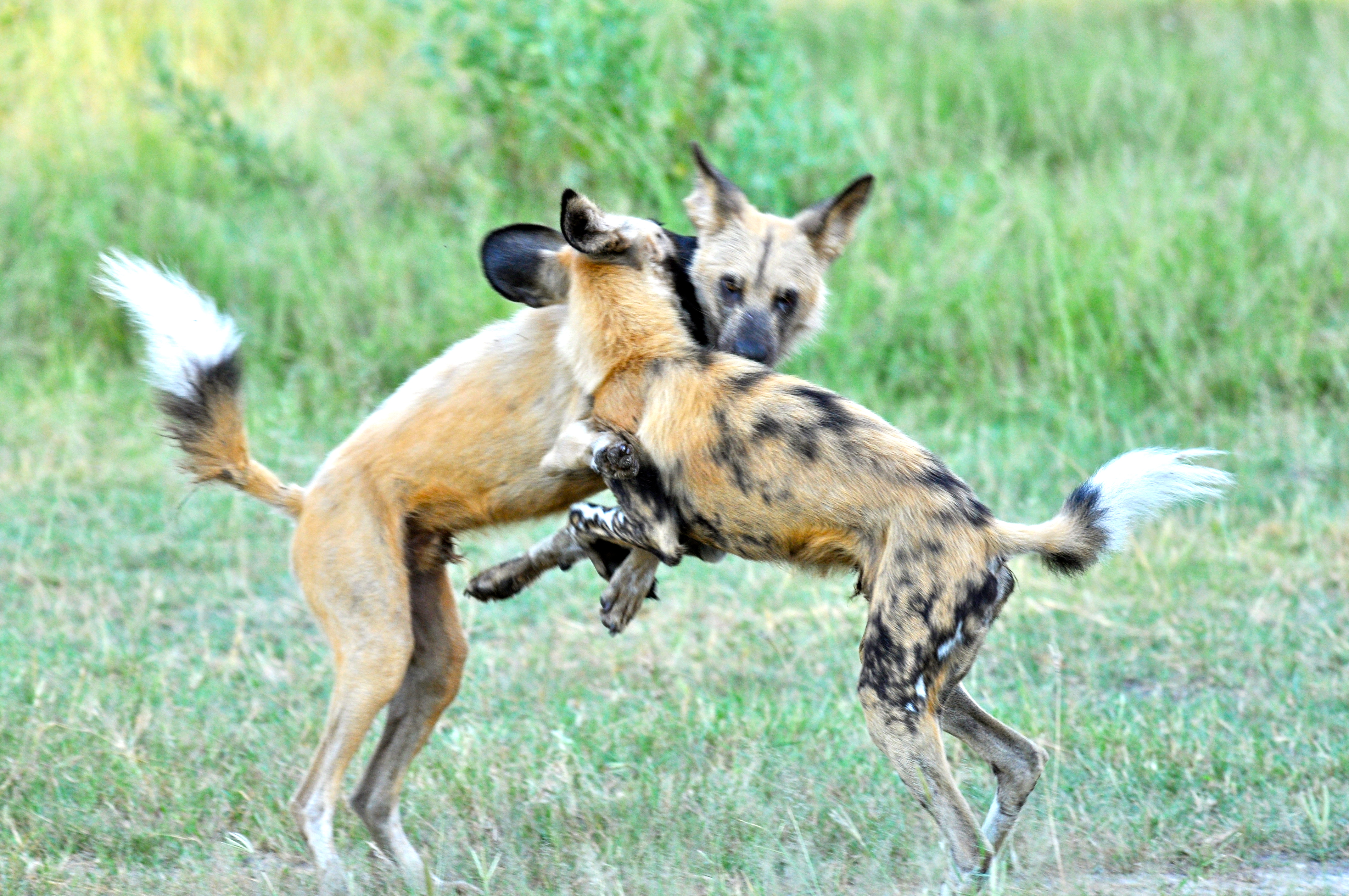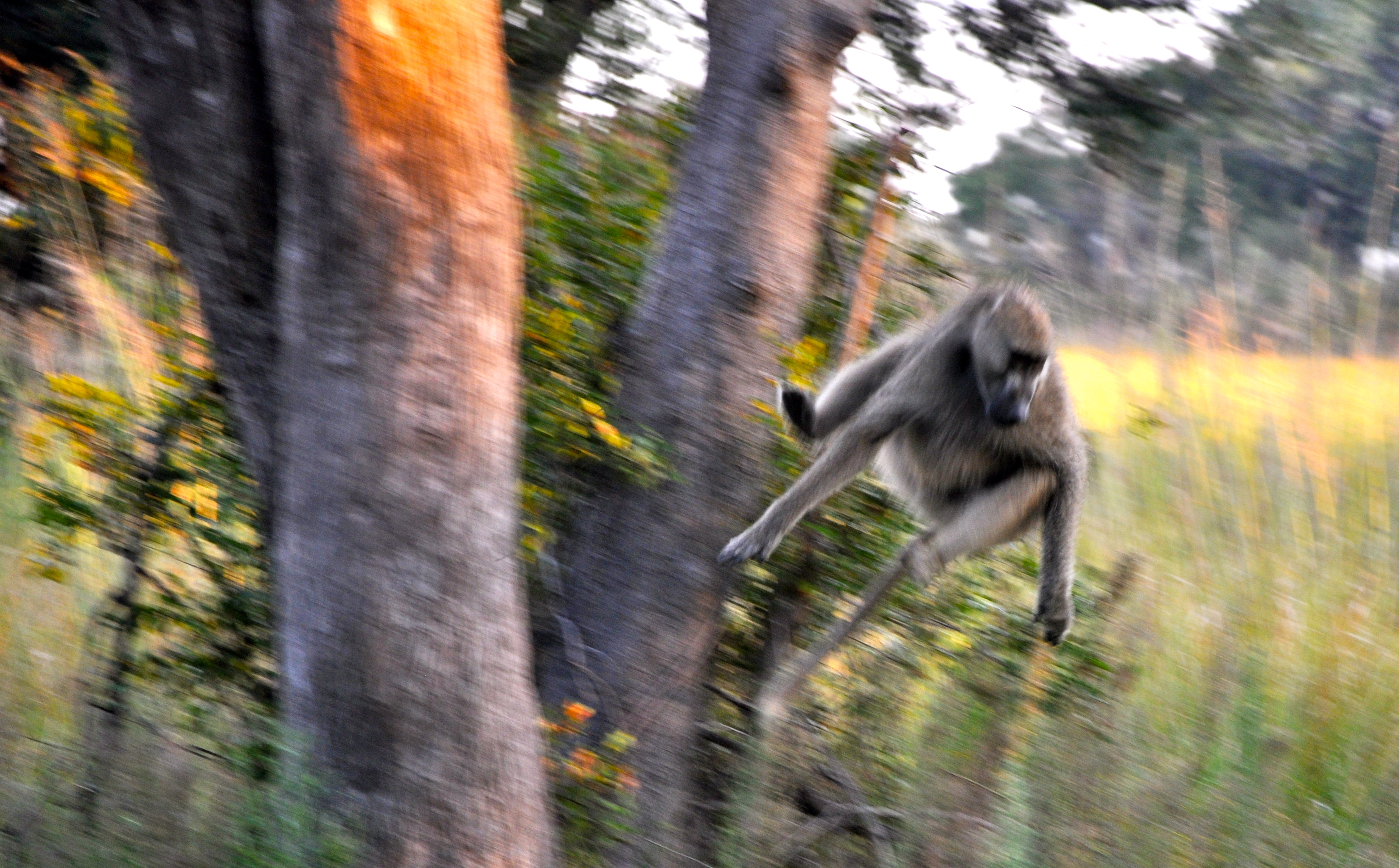 Quando estava entardecendo o grupo se levantou e começou a correr, como se tivessem caçando uma animal. Saímos atrás do grupo quando presenciamos uma tentativa de caça a um grupo de babuínos. Os cães não foram bem sucedidos, os babuínos escaparam.