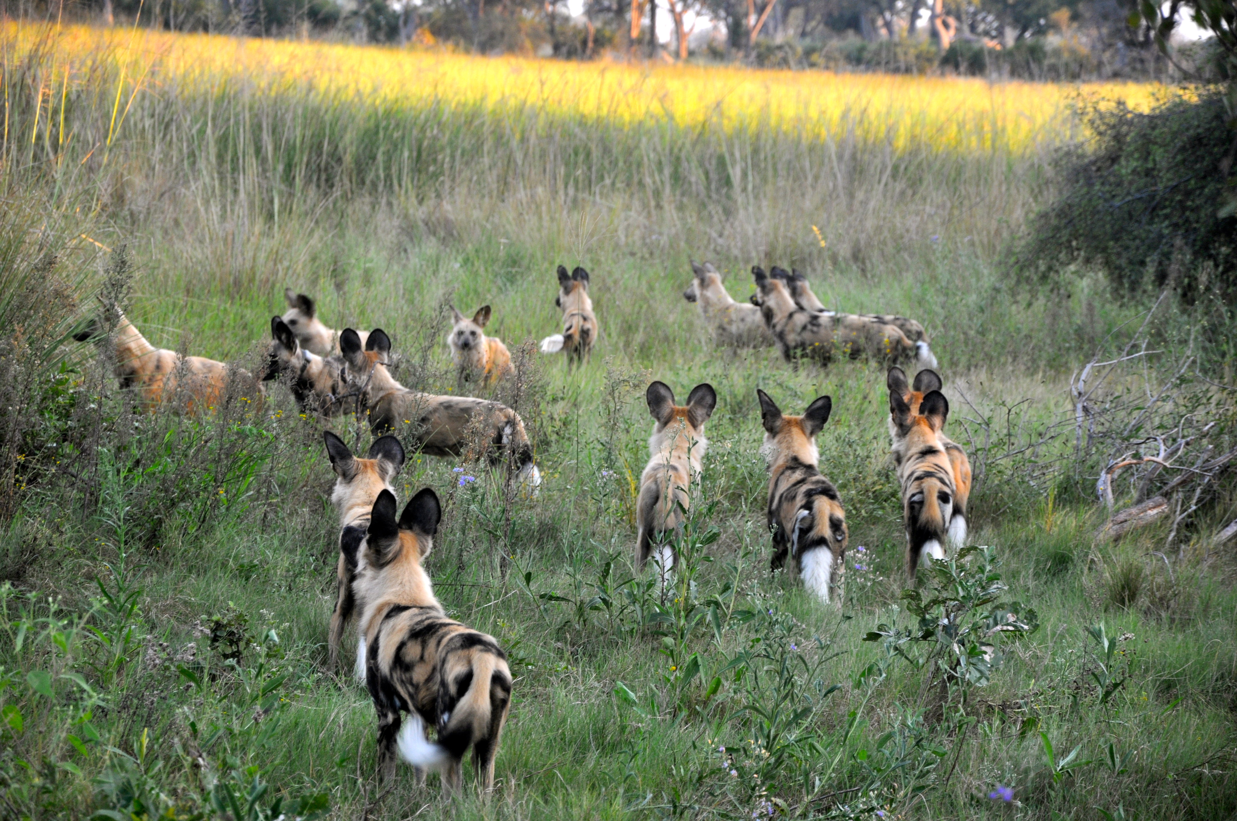 Saímos dos elefantes e seguimos adiante. A próxima parada foi num grupo de Cães Selvagens. Eram mais de vinte animais. Estavam descansando. Paramos para observar.