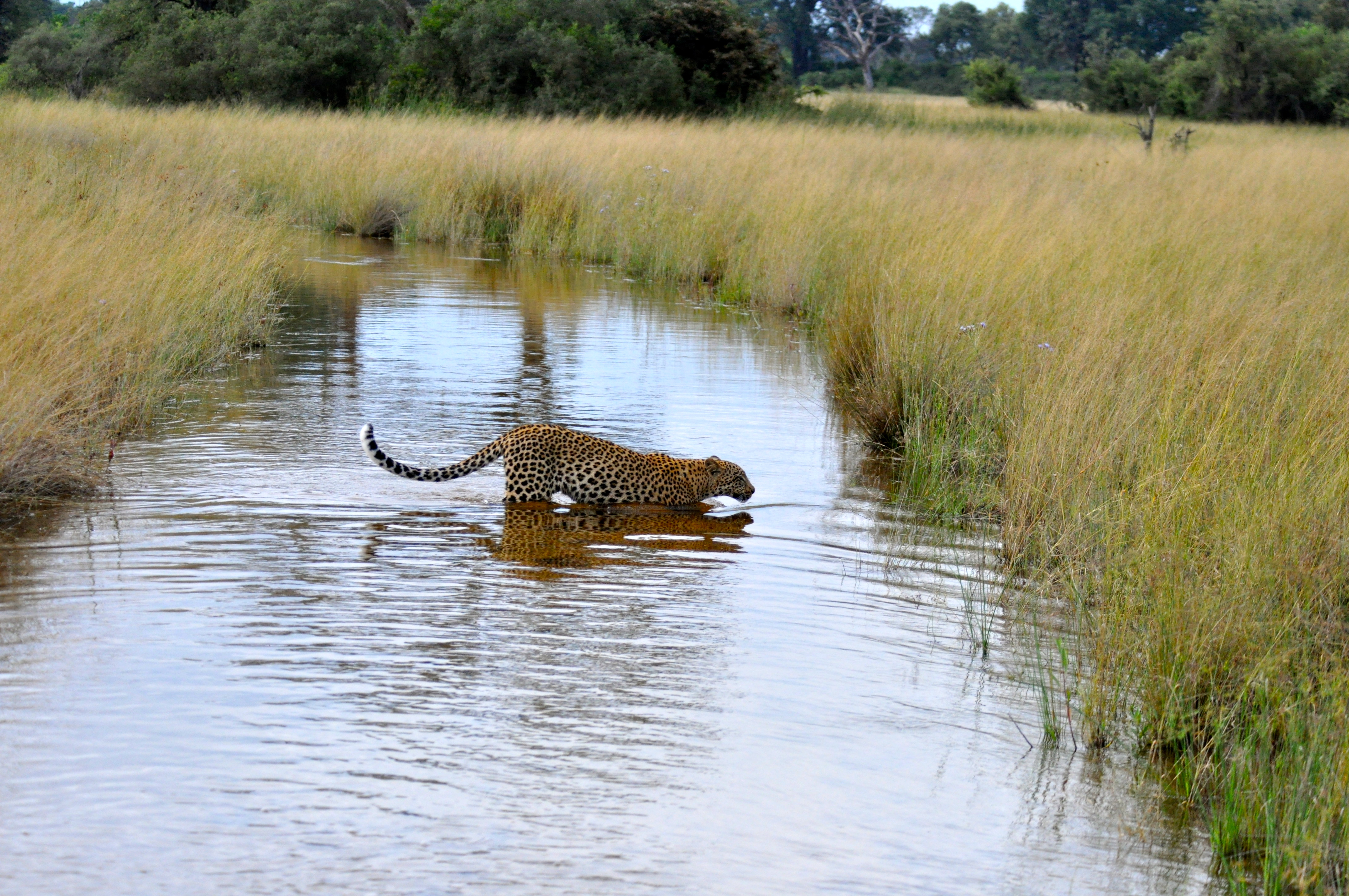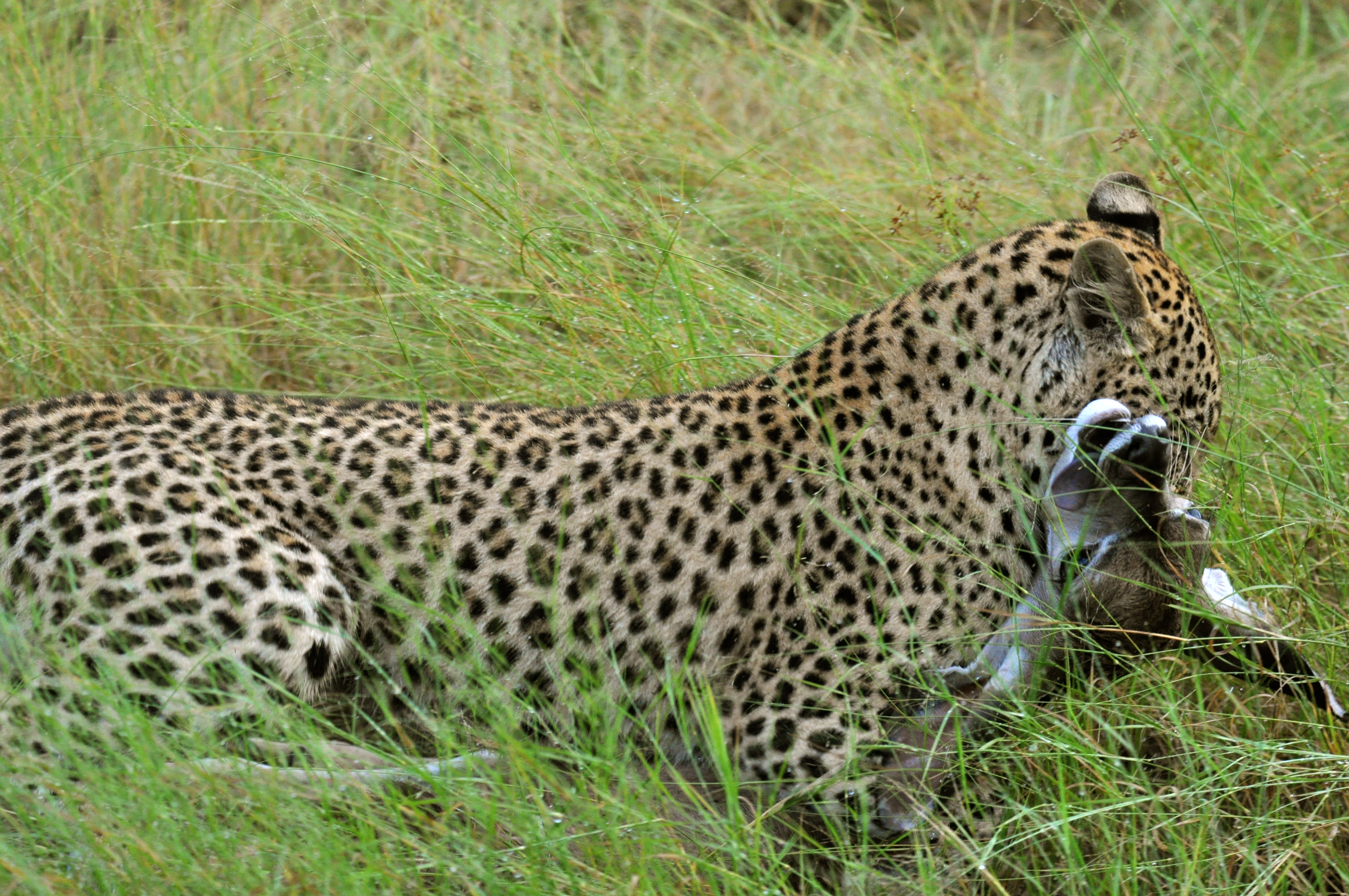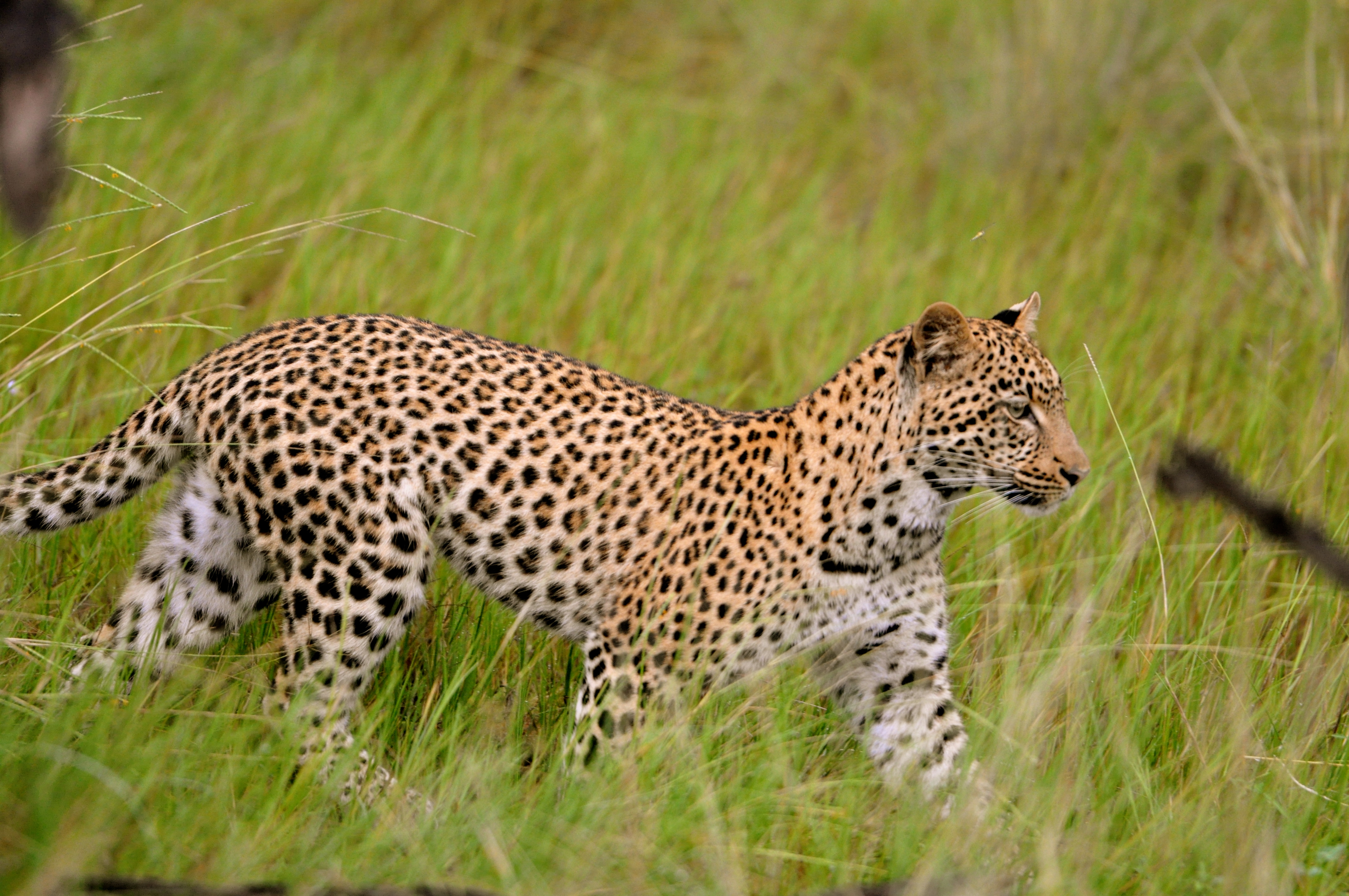 Foi uma grande emoção quando avistei o leopardo. Fui o primeiro a ver. Era uma jovem fêmea de aproximadamente um ano de idade. Estava em cima de uma árvore. Quando nos aproximamos ela desceu e começou a caminhar pelo capim. Sabíamos que a mãe estava perto e seguimos o filhote.