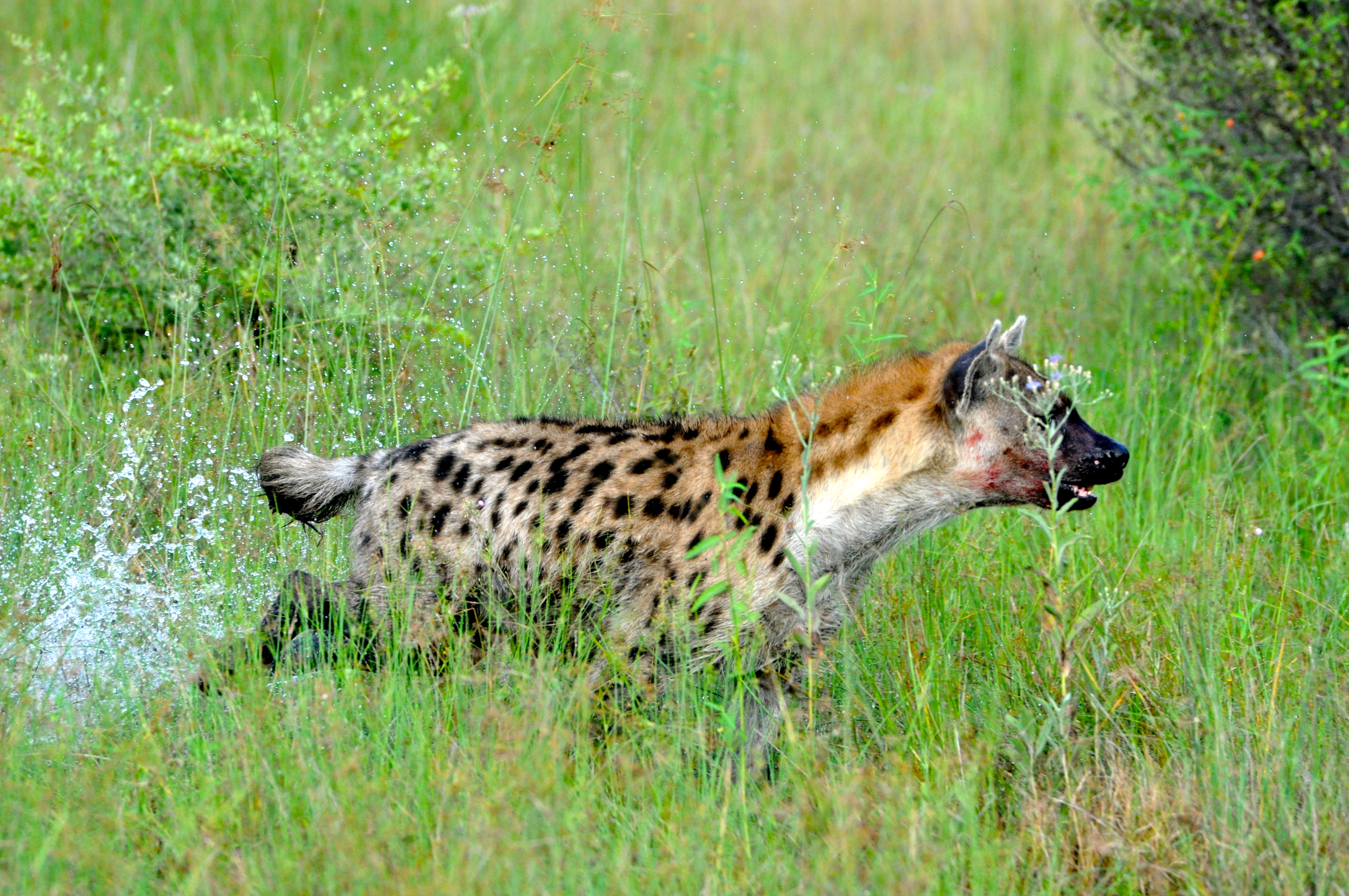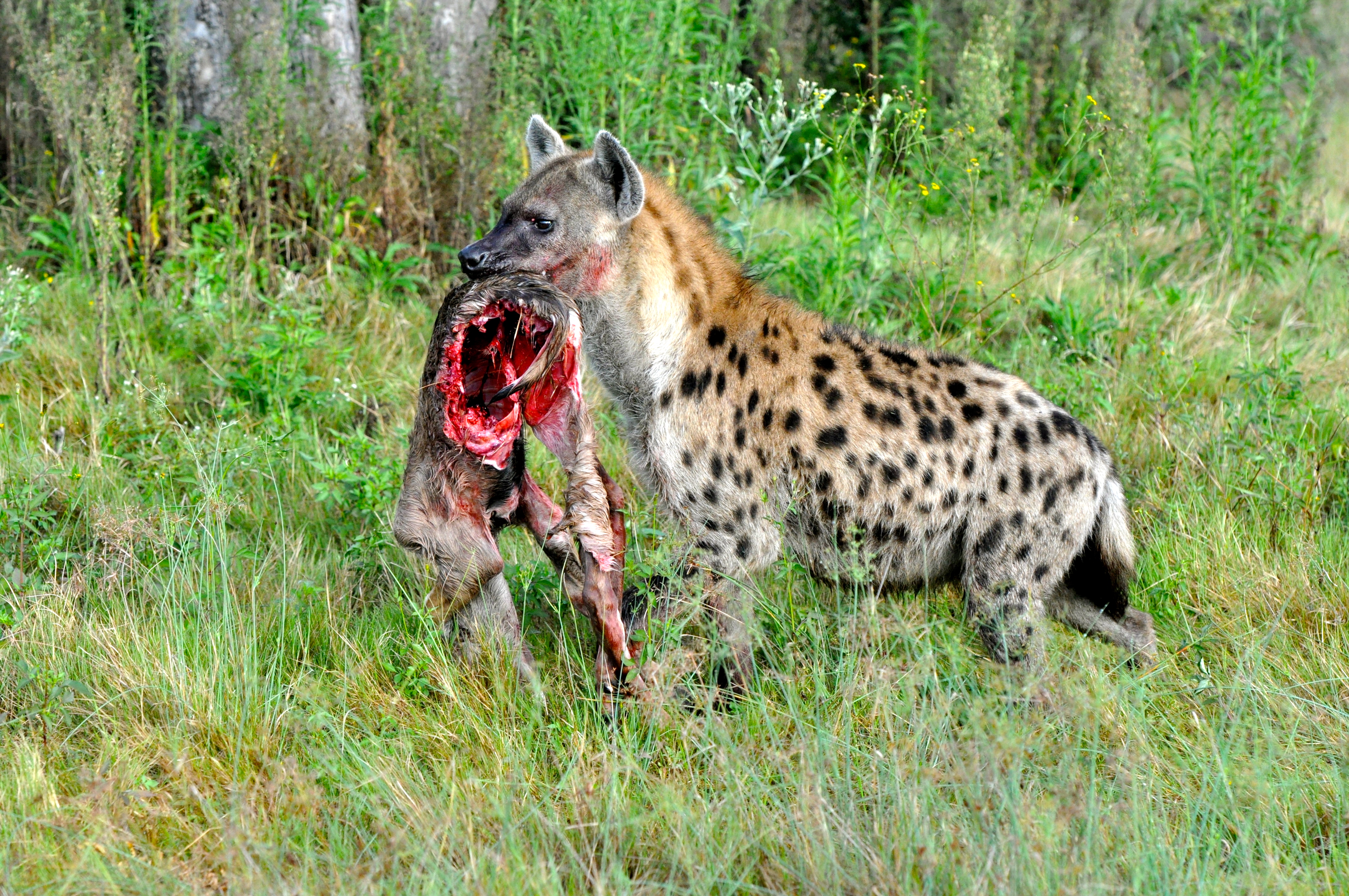 Ao mesmo tempo que o Kudu colocava a língua para fora, perdendo a força e se entregava ao predador, apareceu, numa fração de segundos uma grande hiena, a 30m de distância. A hiena era uma fêmea gigante. A hiena fêmea é maior que o macho.