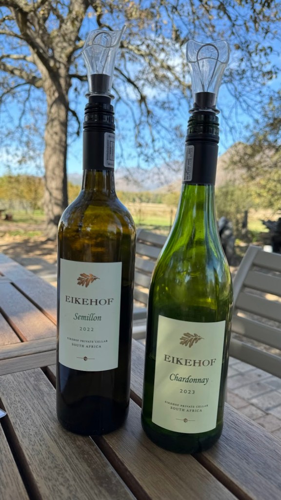 A terceira vinícola que visitamos foi a Eikehof, uma pequena vinícola familiar, com características de uma boutique de vinhos. Fica a oeste de Franschhoek, próximo à localidade de La Motte. Uma preciosidade escondida sob carvalhos antigos, que pertence à família Malherbe, desde 1903. Hoje, 120 anos depois a vinícola é comandada pela quarta geração da família. Fomos recebidos por um dos herdeiros da família Malherbe para uma degustação de vinhos acompanhado de queijos e geleias.