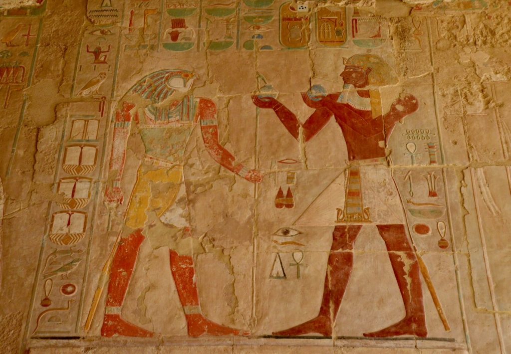 Num dos templos anexos, a Capela de Anúbis possui grandes murais bastante coloridos. Um deles é o relevo que representa Tutmés III fazendo oferendas ao Deus-sol, Rá.
