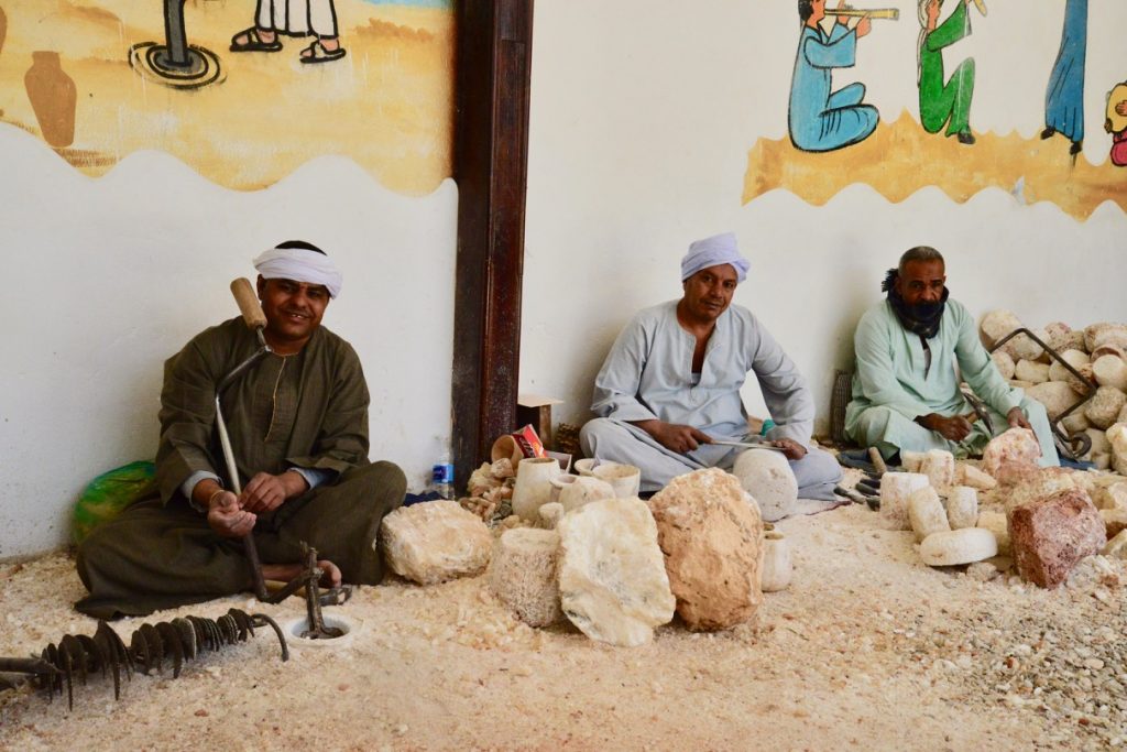 Após a visita ao Templo da Faraó Hatshepsut, saímos para conhecer uma loja que produzia artesanatos de pedras do Egito. Assistimos a uma demonstração da produção e seguimos adiante.