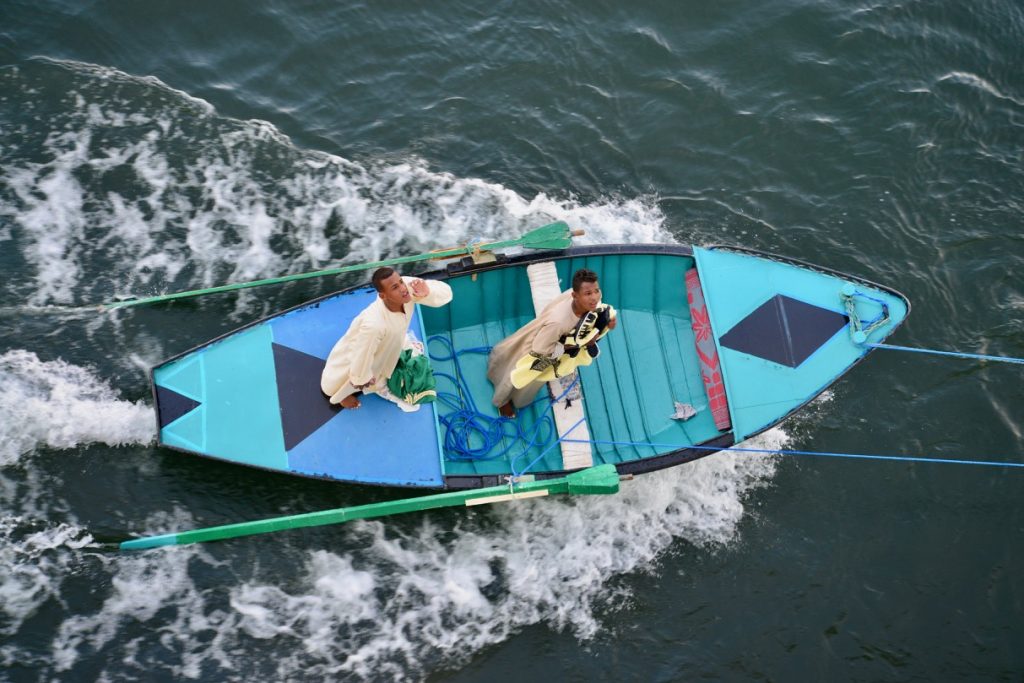 Começamos a subir o rio em direção a Aswan. Ao longo da navegação, o navio é “perseguido” pelos vendedores ambulantes que vêm com barcos na beira do navio e gritam para os hóspedes que estão no deck da piscina oferecendo os seus produtos. Caso algum hóspede aceite a negociação, eles jogam o produto para dentro do barco a aguardam o pagamento, que também é arremessado de volta.
