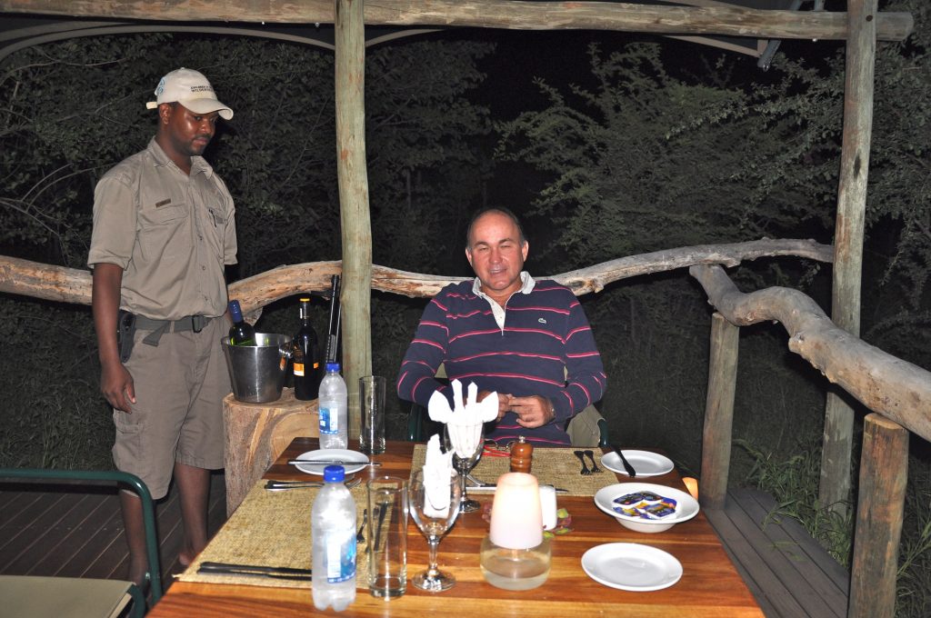 Foi muito interessante, pois estava uma noite escura, com uma fina lua crescente e ouvíamos a todo momento os barulhos da savana. Um leão começou a rosnar e não foi possível deixar de perguntar ao “garçom”, se aquilo era seguro.