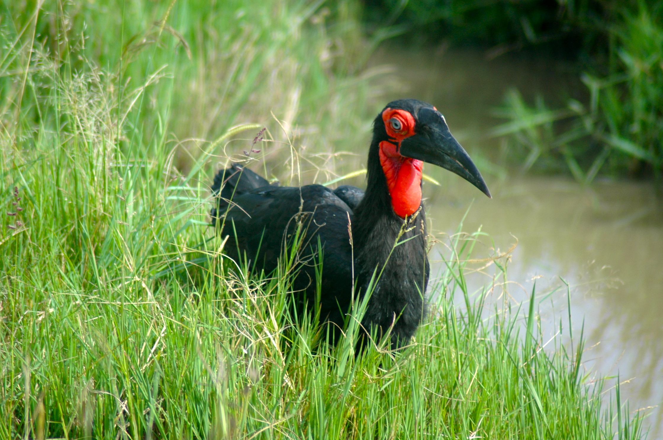 Quando retomamos o safari, fomos presenteados por um belo exemplar de um southern ground hornbill. O Hornbill é um pássaro africano que mais caminha do que voa, de penas pretas e uma papada vermelha bem acentuada. Está ameaçado de extinção, pode chegar a 1,3m de altura.