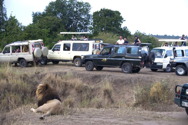 Enquanto observávamos os gnus, fomos presenteado por um grande leão macho, que se aproximou do nosso carro. Um grupo de carros de safari cercavam o leão e era visível o seu desconforto. Quando fizemos safaris em Botswana, havia uma regra local, onde apenas três carros podiam ficar observando a mesma cena animal por cada vez. No Quênia, não existe controle sobre o número de carros que podem ficar próximos dos animais.
