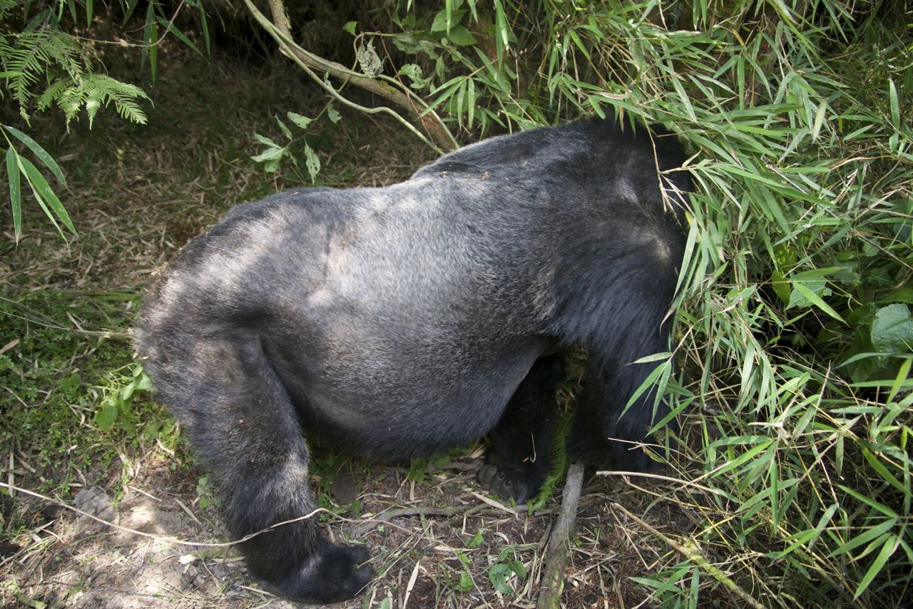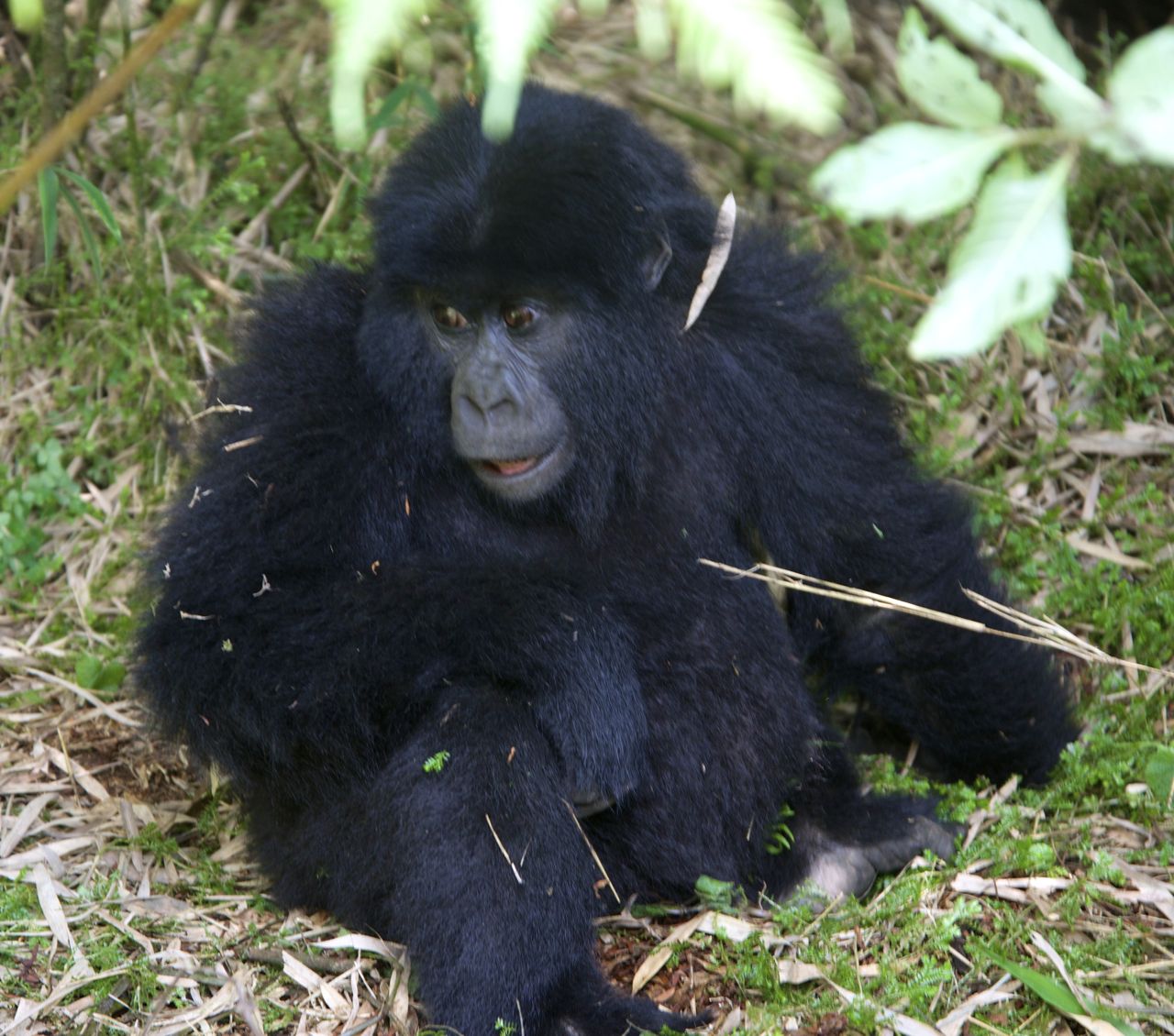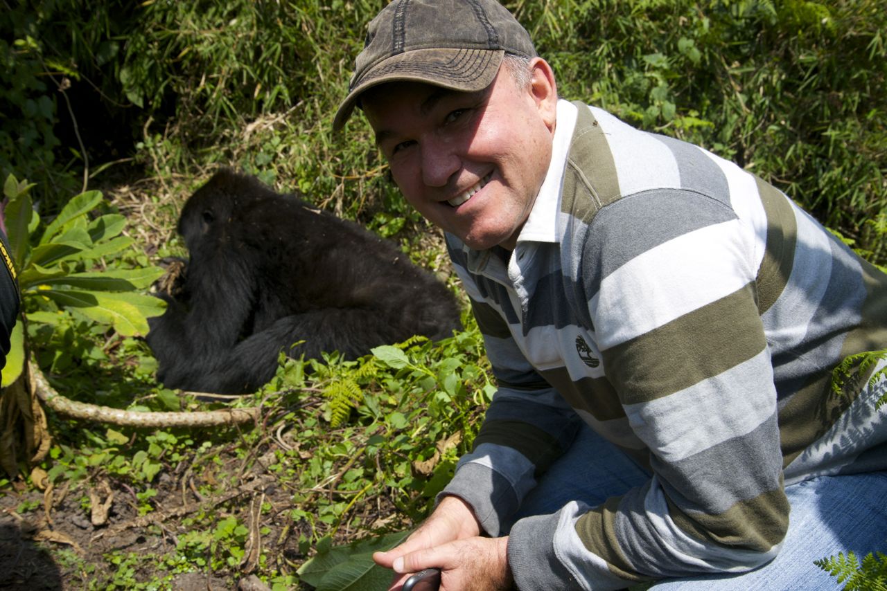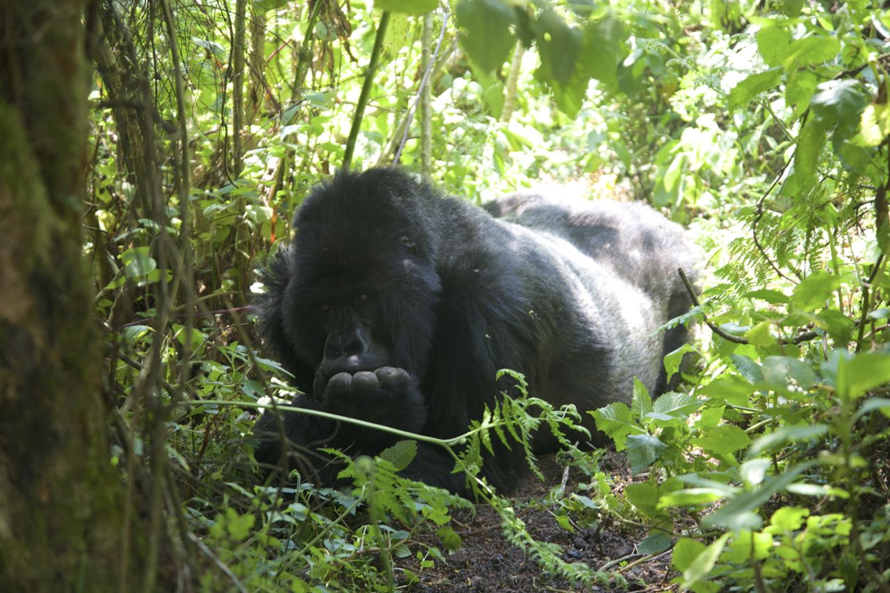 A vegetação fechada dificultava a visão dos gorilas, mas sabíamos que estavam ali. A impressão é de que estávamos sendo observados a todo momento. Seguimos pelo mato fechado, quando de repente nos encontramos com o macho dominante (The Big Boss), o chefe da família e descendente direto de Titus, bisneto de Digit, o gorila da Dian Fossey.