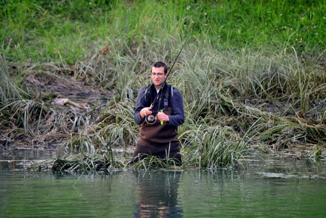 Seguimos as dicas de uma senhora que nos orientou no centro de turismo e fomos jantar num restaurante de frutos do mar, na beira de um canal de mar, onde acontece um fenômeno interessante. A maré na região de Anchorage sofre uma variação gigantesca. É a segunda maior maré do Mundo. Na beira desse canal, quando a maré começa a descer, milhares de salmões e outros peixes se tornam presas fáceis para os pescadores.