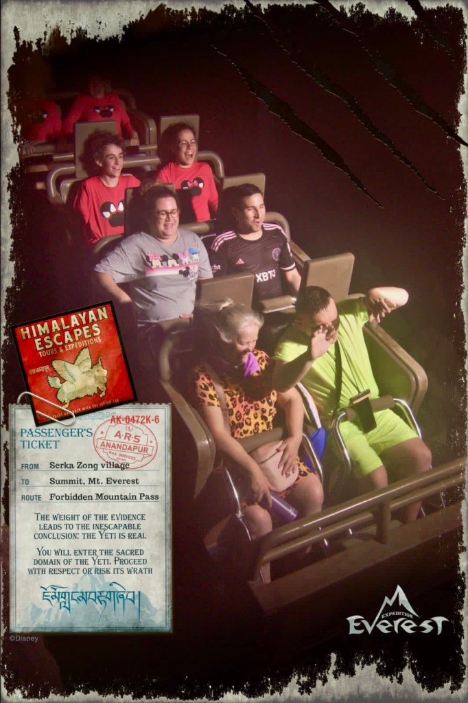 O nosso grupo se dividiu e alguns foram à Expedition Everest, a Montanha Russa do Everest – Hymalaian Scapes. Baseada na história do Abominável Homem das Neves, tem como cenário de fundo as montanhas do Himalaia. É uma montanha-russa radical com 1350 metros e que pode atingir até 80 km/h, com muitos momentos de emoções.