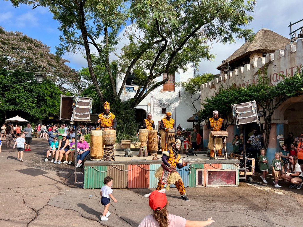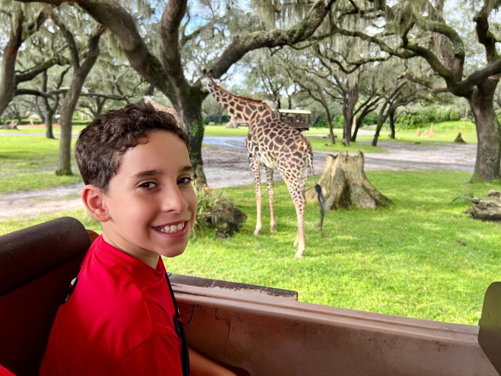 Começamos as atrações do parque pela África e fomos logo para um dos programas imperdíveis. O Kilimanjaro Safari, que simula um Safari no Serengeti, como se faz nas reservas privativas daquele continente. Os carros de safari são veículos 4X4 que chegam bem perto dos animais e torna possível conviver com zebras, gnus, elefantes, girafas e outros animais comuns na Planície do Serengeti, no Quênia. O safari dura aproximadamente meia hora.