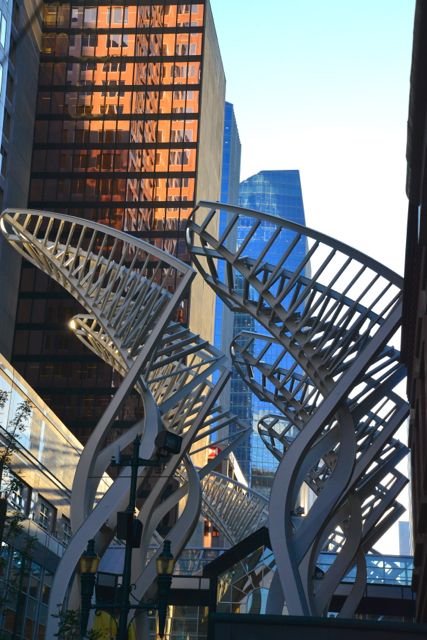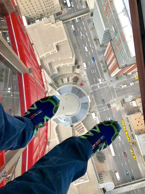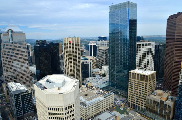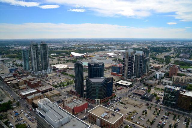 Começamos a conhecer a cidade pela Calgary Tower, uma das suas construções mais altas, com 191 metros de altura. No alto da torre existe um restaurante giratório e uma plataforma de observação com piso de vidro e belas vistas do entorno da cidade. Nos dias claros é possível ver até as Montanhas Rochosas.