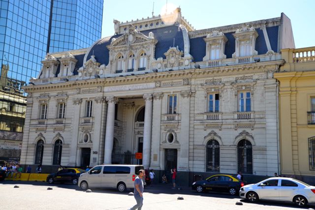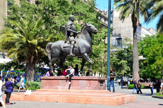 Começamos a visita pelo marco zero, pela parte histórica da cidade, com a Plaza das Armas, um dos principais pontos turísticos locais. A praça é grande e movimentada. Cheia de artistas de rua, com alguns monumentos e prédios históricos em volta. Dentre os principais edifícios da praça destaca-se o Palácio de La Real de La Audencia, onde funcionou a Suprema Corte de Justiça e hoje sedia o Museu Histórico Nacional com um acervo que remonta ao passado colonial do Chile. A Agência Central dos Correios funciona num belo prédio neoclássico onde antes foi a casa de Pedro de Valdivia, o fundador de Santiago.