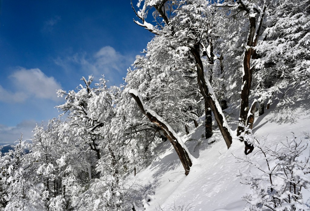 Seguimos direto para o Cerro Catedral, a maior e melhor estação de esqui da América do Sul. A principal atração dos arredores de Bariloche. Fica 19 km a leste da cidade. Na estrada já dava para ver o que teríamos pela frente. As florestas e campos estavam totalmente cobertas de branco. A neve tinha sido intensa durante toda a madrugada.
