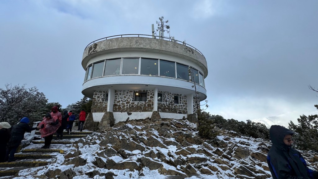 Existe uma lanchonete no alto do mirante, que nos protege do frio e ajuda a recuperar o ânimo para contemplar o mirante, fazer algumas fotos e nos prepara para a decida. Já tínhamos ido a Bariloche e ao Circuito Chico em anos anteriores. Dessa vez, nos passou uma ideia de decadência. A pandemia da COVID19 e a crise da Argentina machucaram essa infraestrutura.