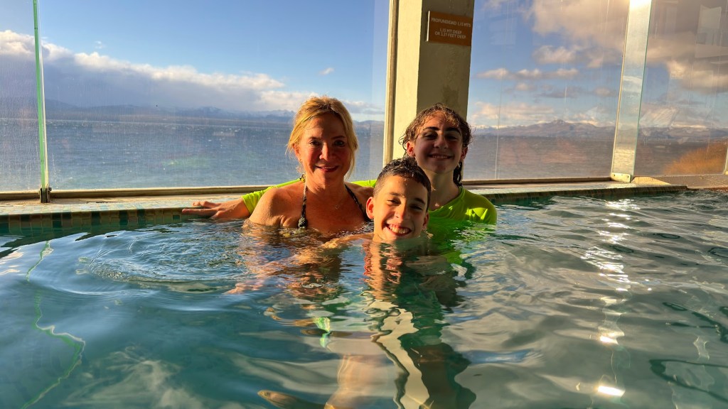 Voltamos para o Hotel Alma del Lago e decidimos aproveitar o fim da tarde e o pôr-do-sol para tomar um banho na piscina aquecida do hotel, pendurada sobre o Lago Nahuel Huapi, com uma vista incrível em nossa frente.