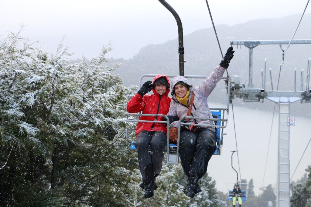 Na sequência do Circuito Chico, paramos no Cerro Campanário, um dos lugares turísticos mais famosos dos arredores de Bariloche. Subimos no Cerro, num teleférico com cadeirinha. A chuva aumentou e começou a nevar. A neve nos pegou no meio do caminho e a sensação de frio aumentou ainda mais.
