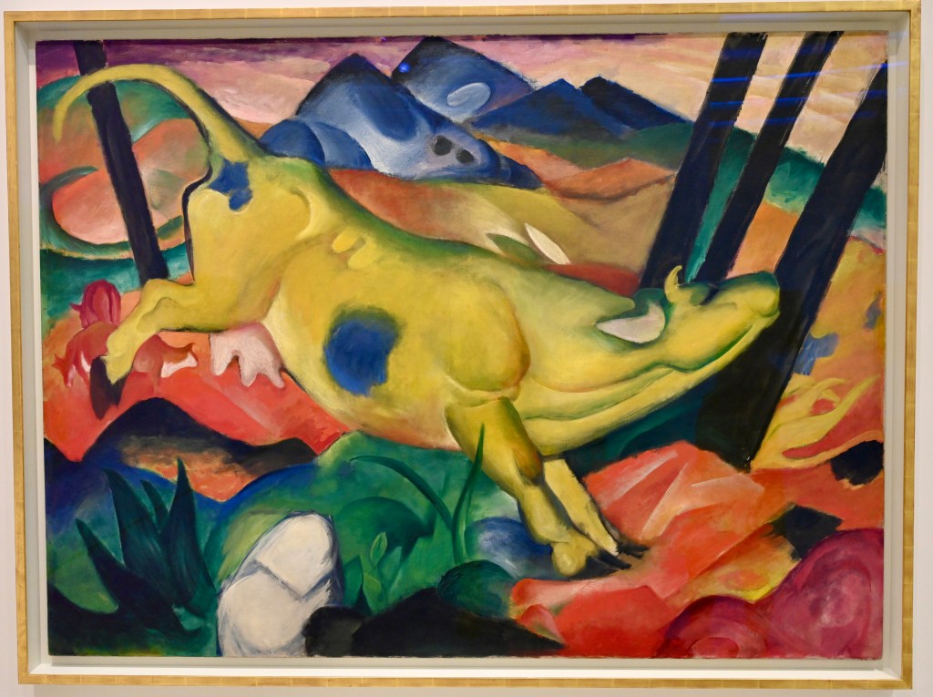 A obra de Franz Marc em destaque abaixo, se destaca pelo uso intenso das cores e pela forma como o cervo, é representado de maneira não naturalista. Marc utilizava cores com significado simbólico: o amarelo está ligado à energia e à vitalidade, enquanto o azul e o vermelho ao redor criam tensão e profundidade na composição. A cena não busca retratar a natureza de forma fiel, mas sim traduzir emoções e sensações. As formas são simplificadas, quase geométricas, e o ambiente ao redor parece fragmentado, reforçando a ideia de movimento e transformação. No contexto do Museu Guggenheim, a obra ajuda a compreender como o expressionismo rompeu com a representação tradicional e abriu espaço para uma pintura mais subjetiva e interpretativa.