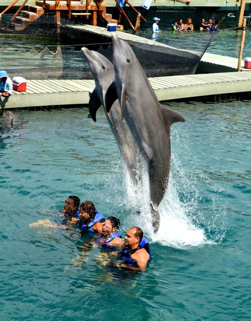 Os adestradores orientam acrobacias para os golfinhos, e grupos de turistas caem na piscina para ter a chance de interagir e tocar nos animais.