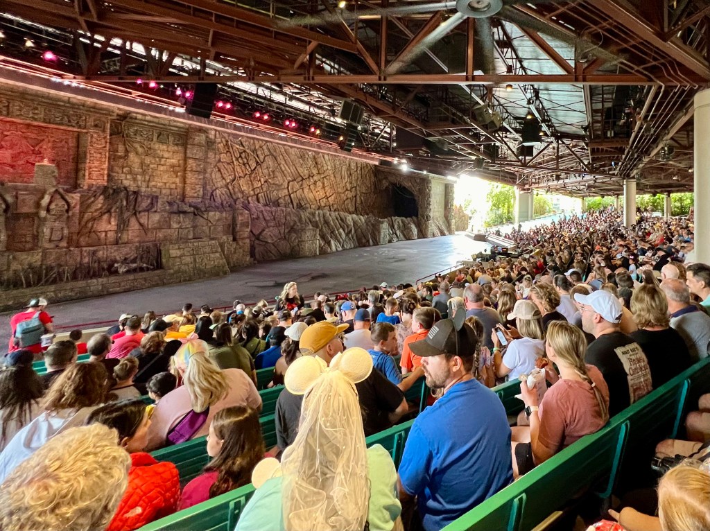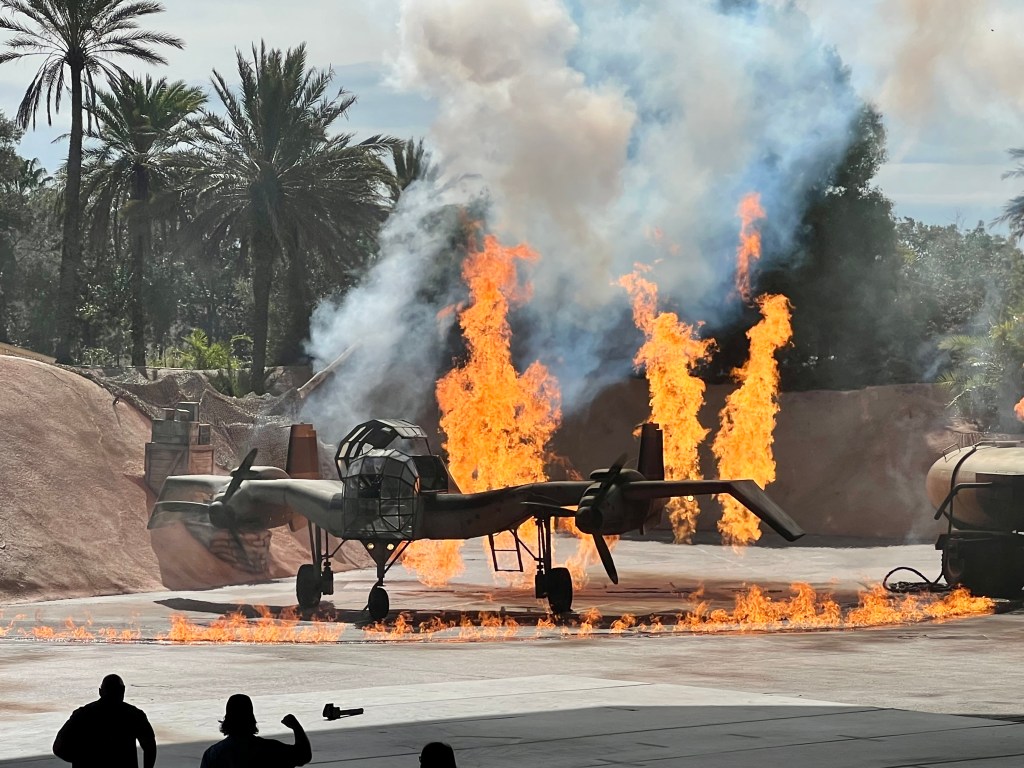 Começamos a maratona das atrações pelo espaço dedicado aos filmes de Indiana Jones. É uma representação teatral de algumas cenas icônicas da saga do herói. O teatro é um espaço enorme em formato de anfiteatro e toda a cena é falada em inglês, mas podemos compreender todas as passagens. A emoção está nos efeitos especiais e na performance dos dublês e atores.