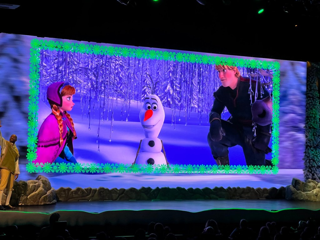 Seguimos para o encontro com a Frozen, no teatro “For the First Time and Forever: A Frozen Sling-Along Celebration, uma atração com os personagens do filme Frozen, que acontece num auditório. É uma mistura de filme e interação com atores caracterizados como personagens e apresentação musical. O público se diverte, sobretudo as crianças.