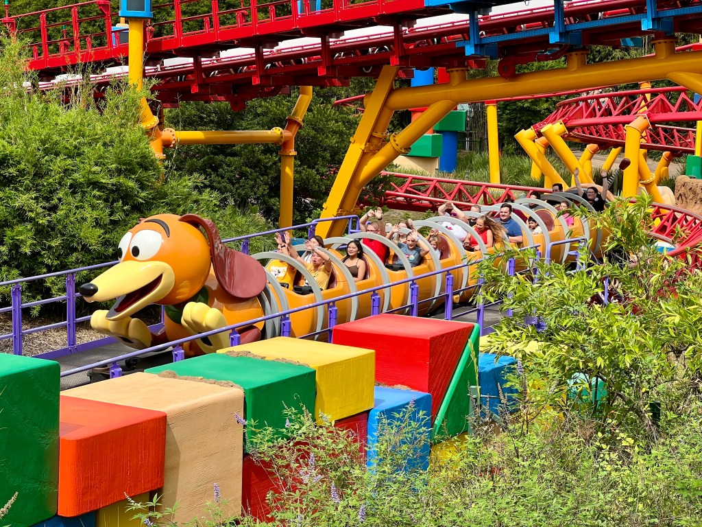 Uma das atrações mais desejadas desse espaço dedicado ao Toy Story é a montanha-russa Slinkin Dog Dash, a mais nova do parque. As molas do Slinky fazem as curvas e o sobe e desce da montanha-russa.