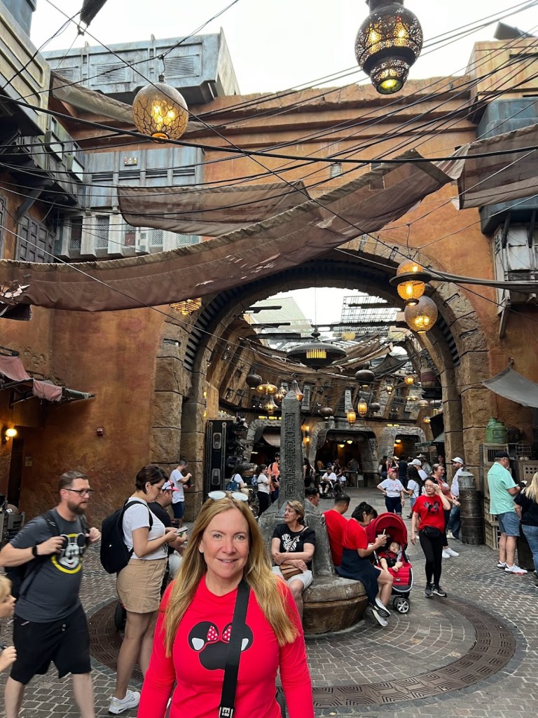 A área mais procurada do parque hoje em dia é aquela dedicada e ambientada na saga de Star Wars. No Star Wars: Galaxy’s Edge todo o cenário é fantástico. É um dos maiores e mais atuais projetos da Disney. A experiência funciona como se estivéssemos num set de filmagem dos clássicos de George Lucas, cheia de detalhes e referências dos filmes. A área representa o Black Spire Outpost, do Planeta Batuu, que aqui no Hollywood Studios foi transformado numa grande lanchonete.