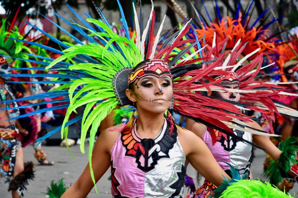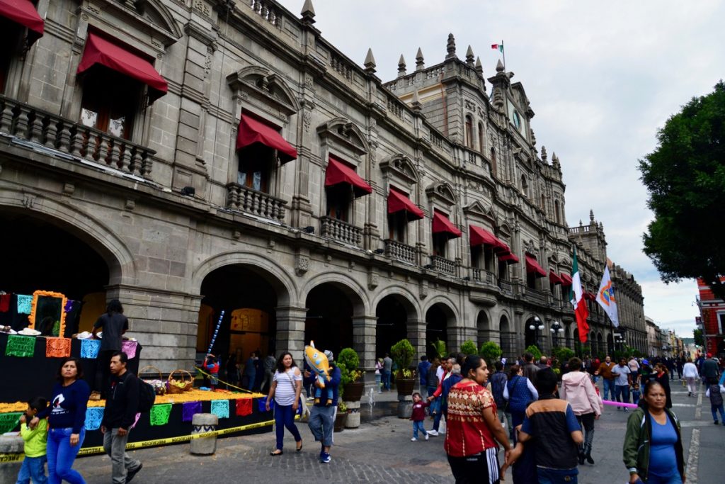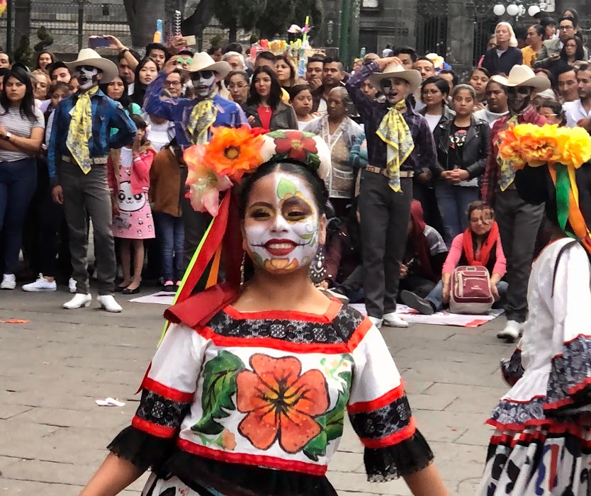 Seguimos caminhando, por entre uma feira de artesanatos, até o Zócalo de Puebla, a praça principal da cidade, em frente à Catedral. No meio da praça assistimos a uma série de apresentações de danças indígenas e coloniais em homenagem ao Dia dos Mortos.