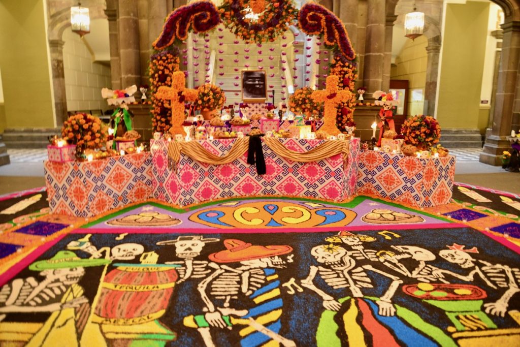 Ainda fazendo parte das comemorações do Dia dos Mortos, fomos visitar uma oferenda especial implantada no interior do prédio da Prefeitura. Havia uma fila enorme de pessoas para ver a oferenda. Tivemos que ficar na fila pois a oferenda seria desmontada naquela noite.