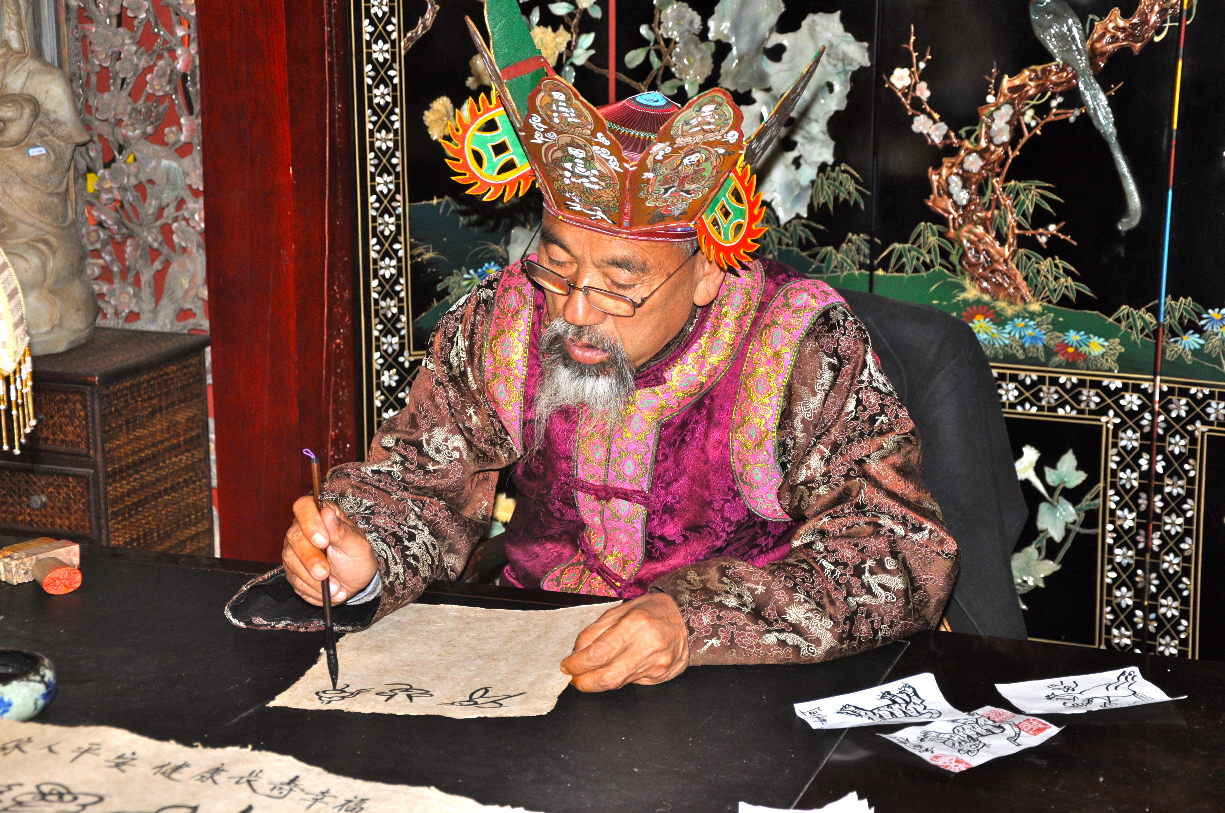 Voltando a Lijiang fomos até o museu Instituto de Pesquisa de Dongba, que é uma instituição acadêmica para a preservação da cultura Naxi. O museu é interessante e conta a história dessa minoria étnica descendentes de nômades tibetanos. Aí ficam alguns Feiticeiros Dongba, os poucos Xamãs que sobreviveram à perseguição da Revolução Cultural.