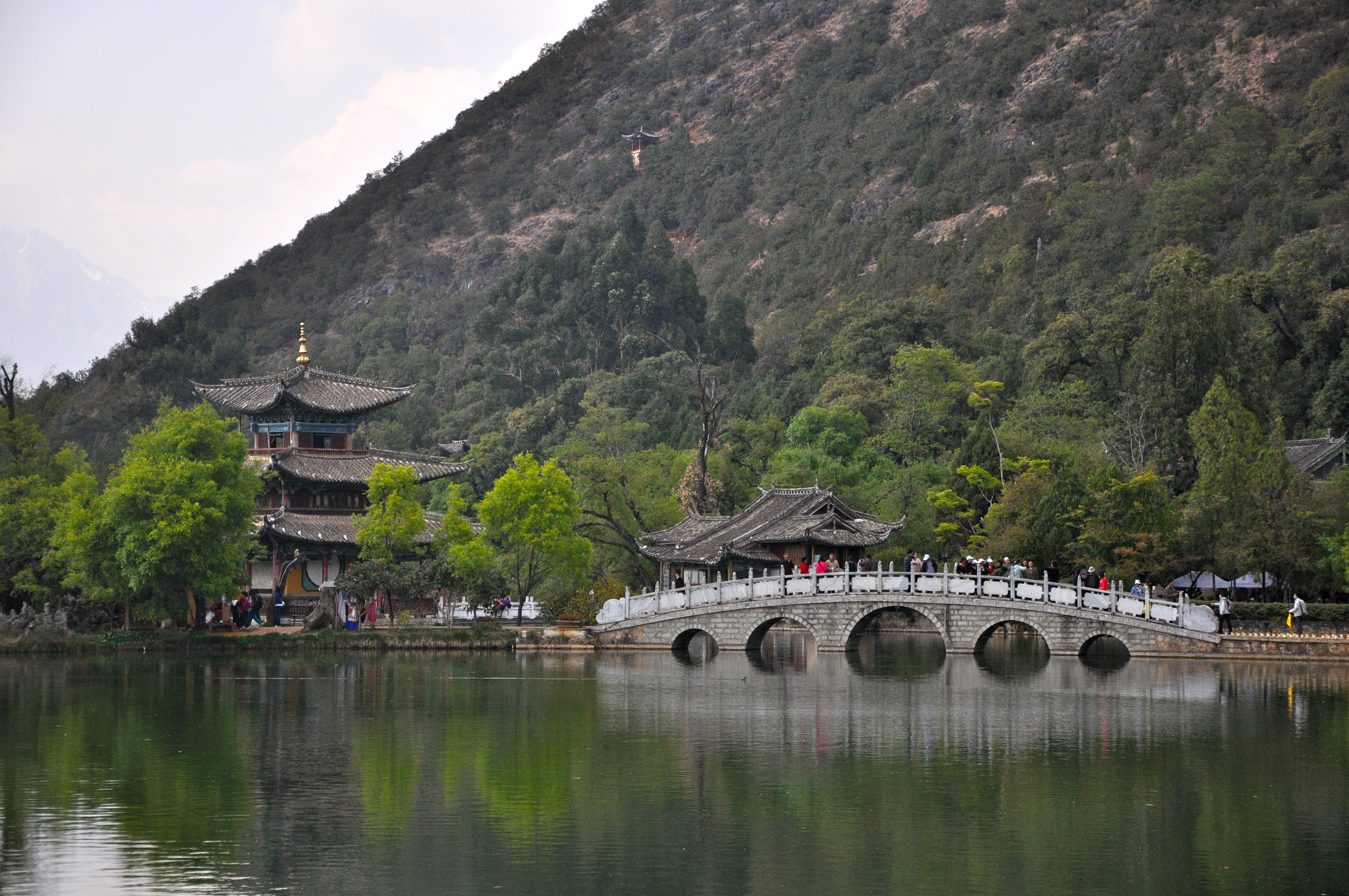 Um monumento no centro do lago cheio de carpas, está ligado à borda por uma ponte charmosa. É um dos cartões postais de Lijiang.