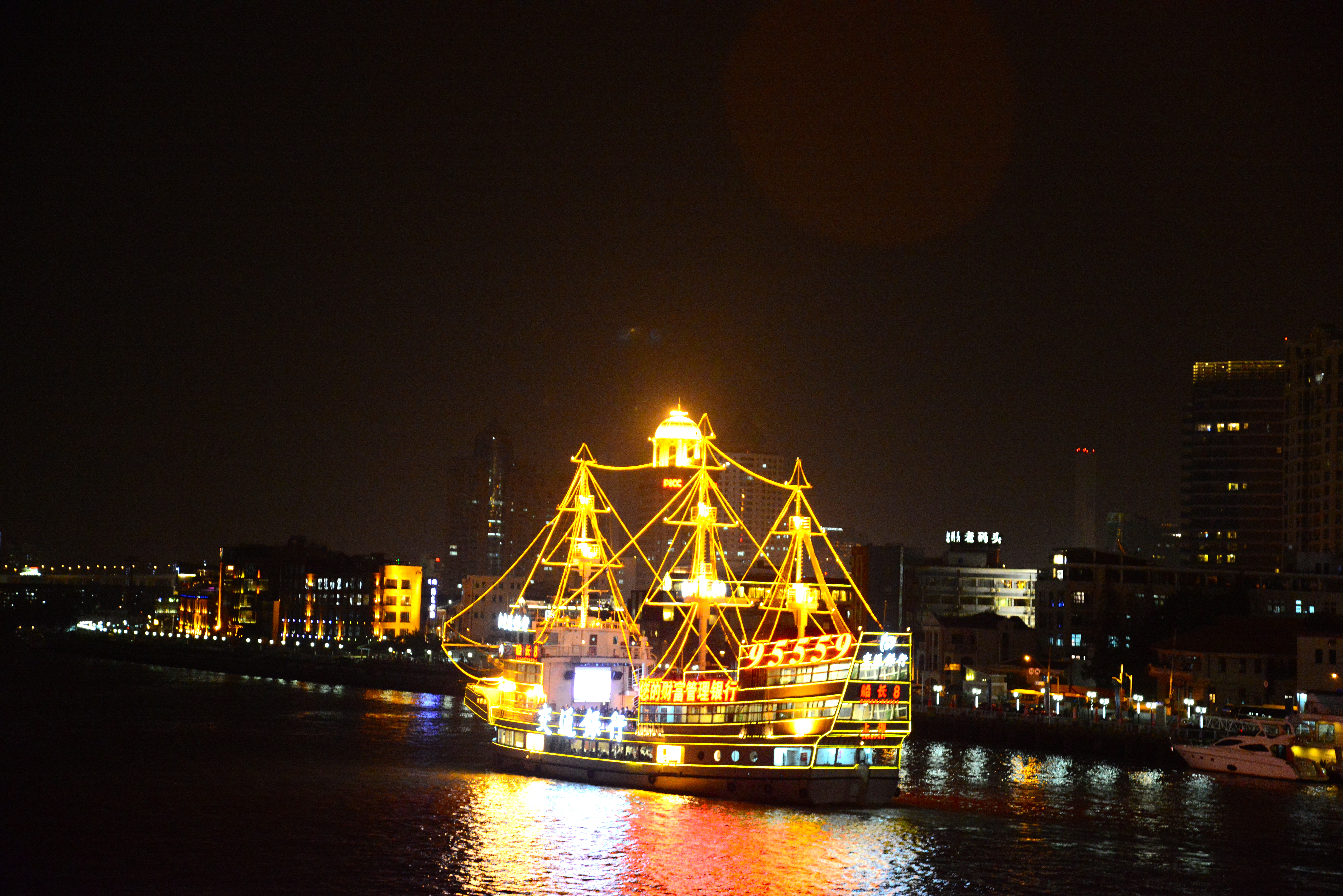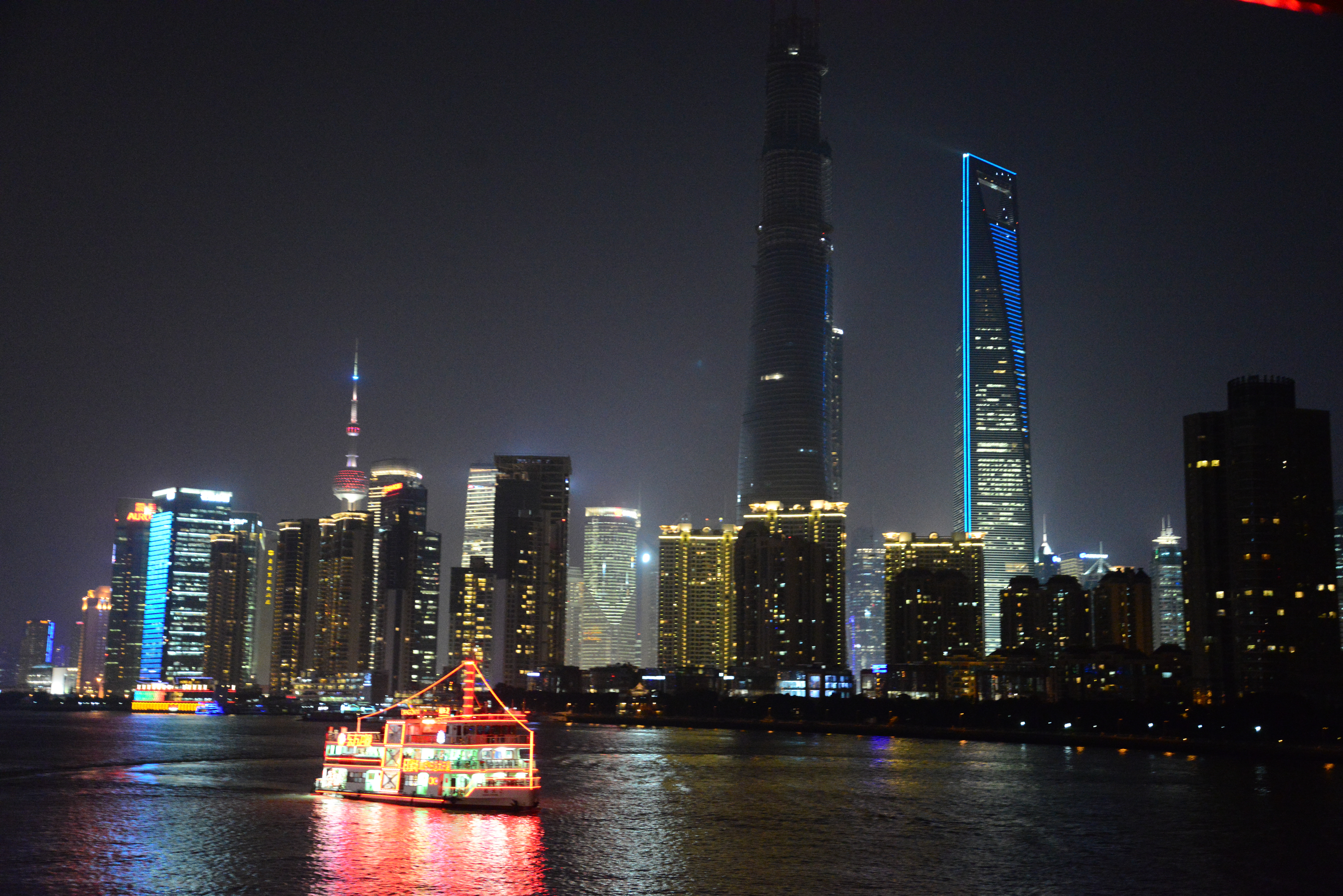 À noite fizemos um passeio de barco pelo Rio Huangpu para admirar o fantástico “Sky Line” noturno de Xangai, com alguns dos prédios maiores e mais modernos do mundo dando um show de iluminação.