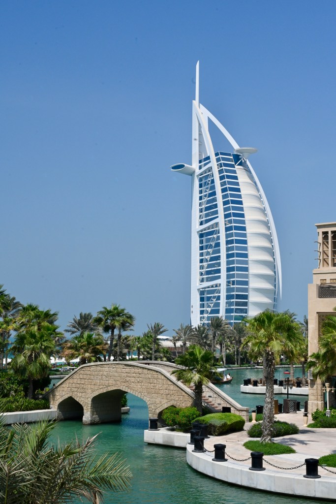Seguimos então para o Souk Madinat Jumeirah, um dos lugares mais encantadores de Dubai. Inspirado nos antigos mercados árabes, o complexo combina arquitetura tradicional com luxo contemporâneo, reunindo lojas, cafés e restaurantes à beira de canais artificiais que lembram uma Veneza árabe. O ambiente é uma celebração da estética e da hospitalidade local: entre palmeiras e pontes, o visitante pode fazer passeios de barco e admirar a vista espetacular do Burj Al Arab. À noite, o lugar ganha ainda mais charme, com iluminação suave, música e o movimento vibrante dos bares e restaurantes à beira d’água. É um espaço onde tradição e modernidade convivem em perfeita harmonia, oferecendo uma das experiências mais autênticas de Dubai.