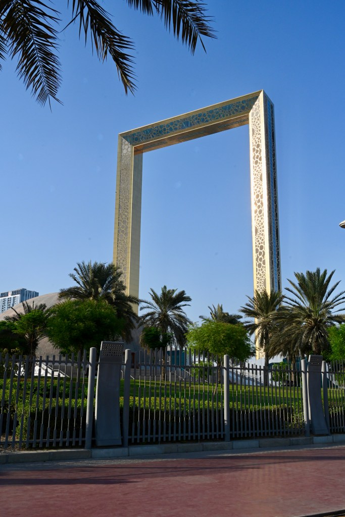 Passamos pelo Dubai Frame, também conhecido como The Frame, uma das estruturas mais criativas e simbólicas da cidade. Inaugurado em 2018, o monumento tem formato literal de uma moldura gigante com 150 metros de altura e 93 de largura e representa o elo entre o passado e o futuro de Dubai. Localizado no Zabeel Park, o Dubai Frame oferece uma experiência visual impressionante: de um lado, aparece o Dubai antigo, com os bairros tradicionais de Deira e Bur Dubai; do outro, o horizonte de arranha-céus futuristas da Sheikh Zayed Road e o majestoso Burj Khalifa. No topo, uma passarela de vidro liga as torres, proporcionando uma vista panorâmica inesquecível. Não chegamos a subir, mas admirar essa obra-prima arquitetônica de fora já foi inspirador.