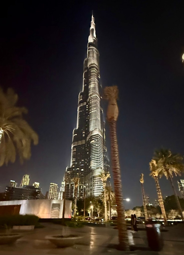 O Burj Khalifa fica no coração de Downtown Dubai. Para chegar até lá, enfrentamos um trânsito intenso, um dos desafios da moderna Dubai, onde o transporte público ainda é pouco usado e quase todos têm carro. É o edifício mais alto do mundo, com 828 metros de altura e mais de 160 andares, projetado pelo arquiteto Adrian Smith. O arranha-céu abriga escritórios, residências, o Hotel Armani, restaurantes e o famoso mirante At The Top, que oferece uma das vistas mais espetaculares do Emirado. Sua iluminação noturna e o espetáculo das Fontes de Dubai criam um cenário inesquecível, um verdadeiro símbolo da engenharia e da ambição humana.