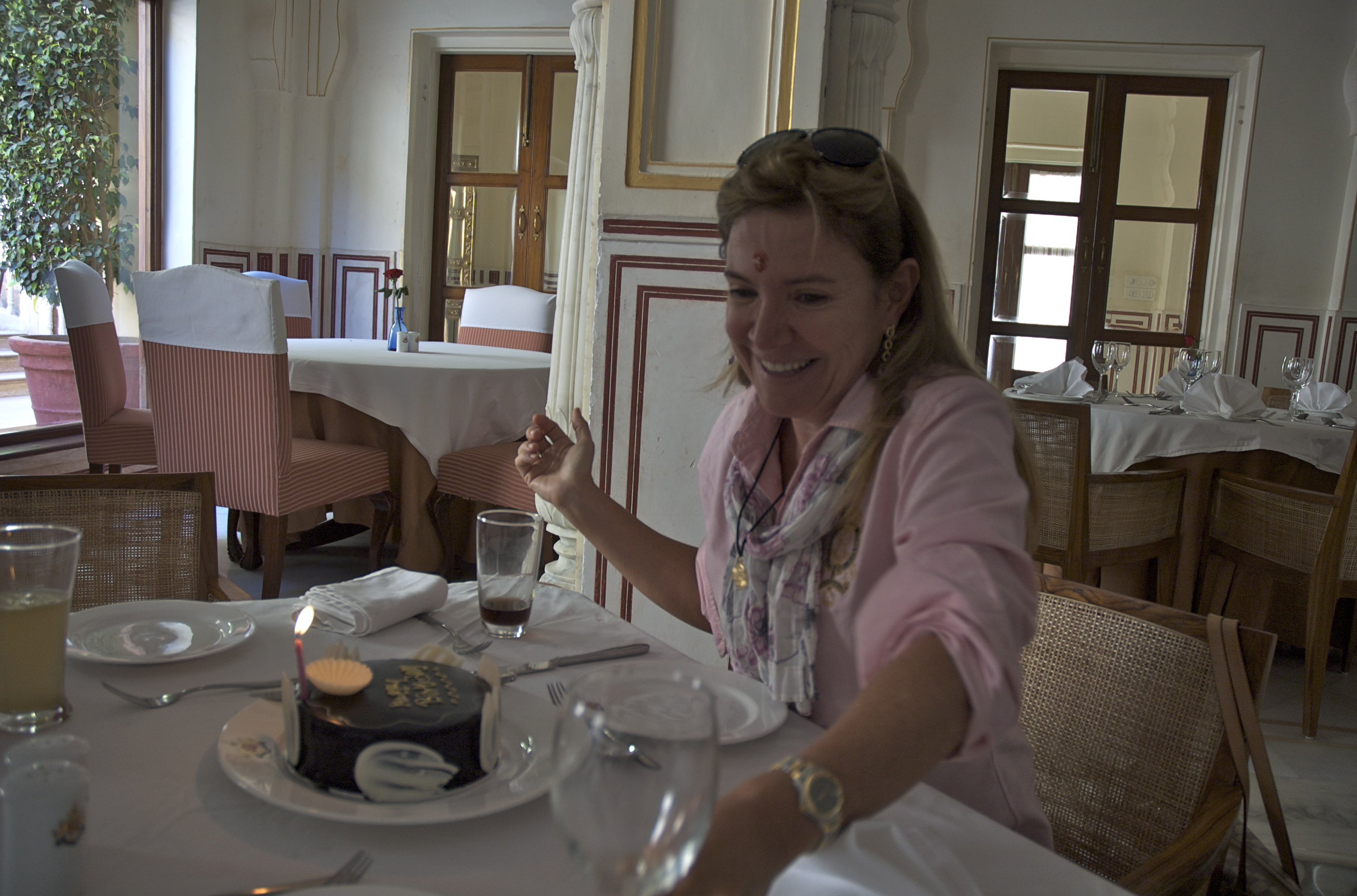 Saímos do hotel às 8h com destino a Jaipur. Conhecemos o nosso novo colega de viagem, um mexicano chamado Alejandro. A viagem seguiu num Toyota confortável, com 5 pessoas (Nery, Mônica, Alejandro, o guia Nique e o motorista indiano (Manee). Mônica ganhou um bolo de aniversário na saída do hotel e guardamos para a sobremesa do almoço.