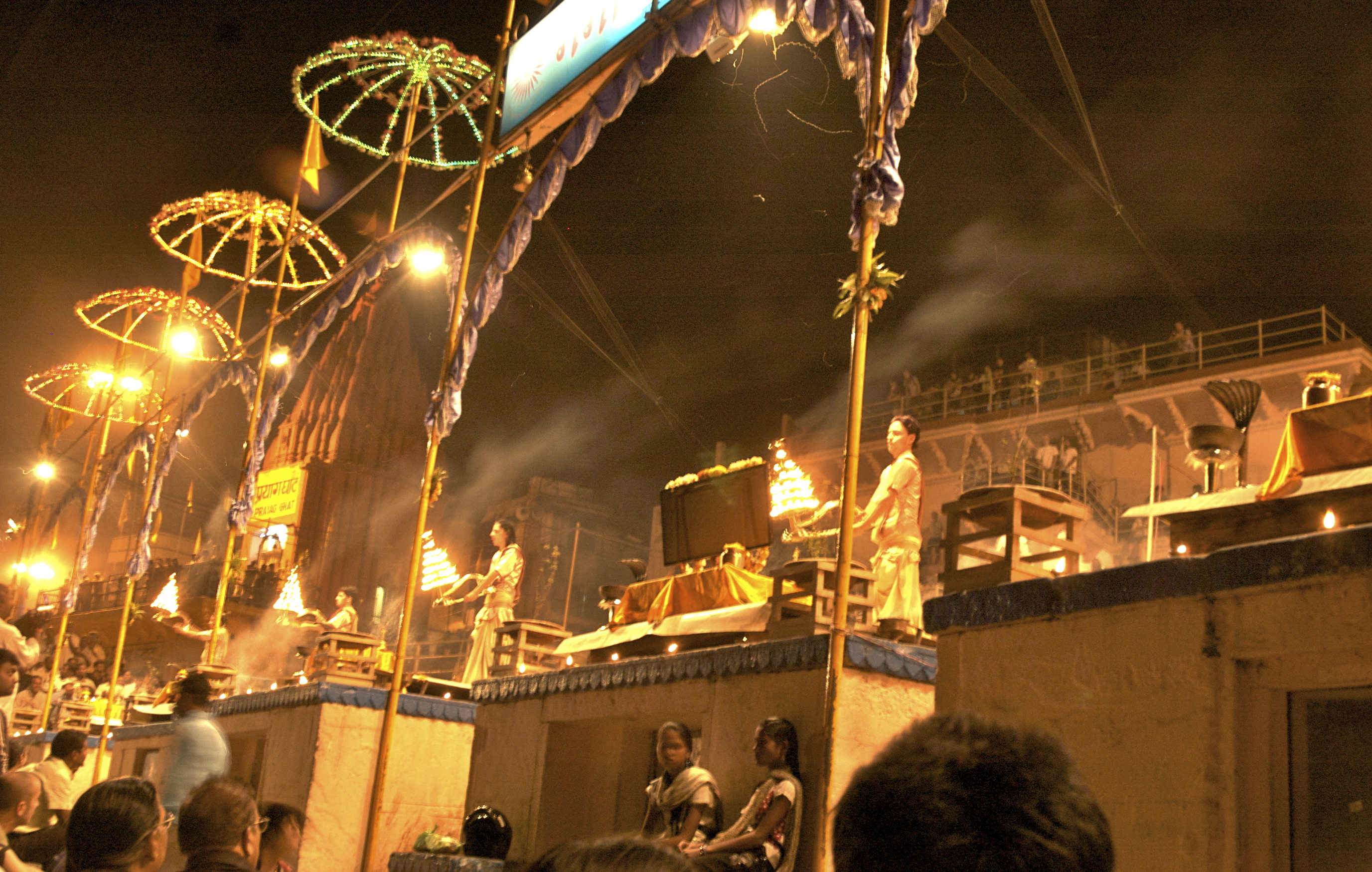 Voltamos para a cerimônia do culto religioso para a Deusa Ganges. Assistimos o início do culto no barco e depois nas escadarias da Ghat. A cerimônia é embriagante. Impossível não se deixar levar pela energia que emana daquele lugar. As pessoas, turistas ou não, ficam absolutamente envolvidas pelos sons, cânticos e luzes das cerimônias.