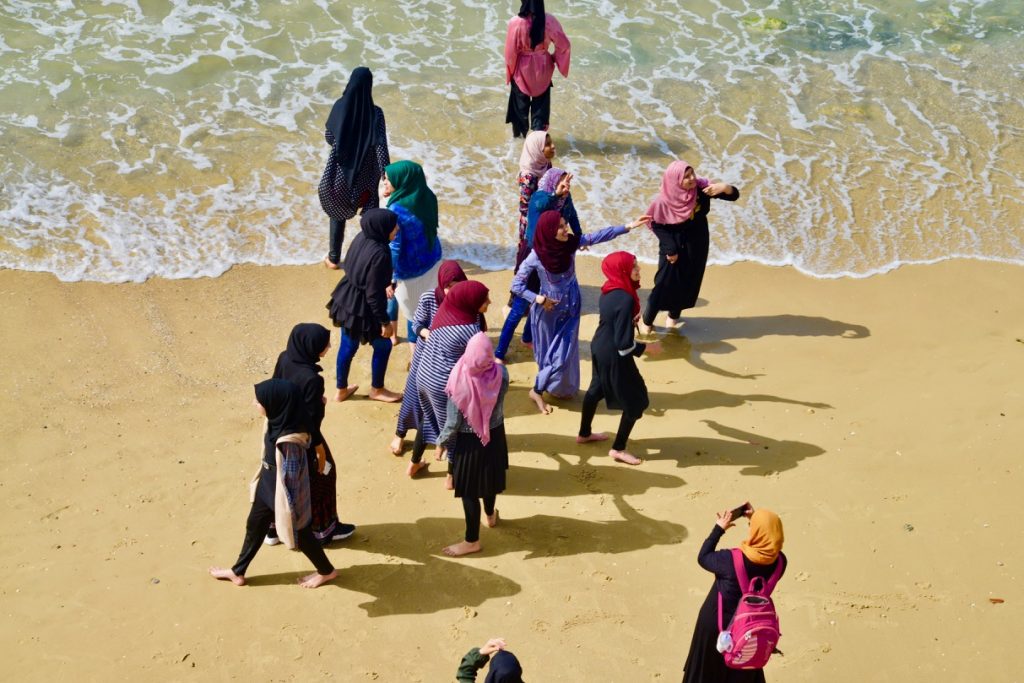Decidimos seguir caminhando, de volta para a cidade. No início da caminhada de volta para Tel Aviv, avistamos uma bela cena de garotas adolescente palestinas usando o tradicional véu muçulmano e se divertindo na beira da praia. Foi o primeiro contato que tivemos com os contrastes culturais entre a cultura muçulmana e a ocidental.