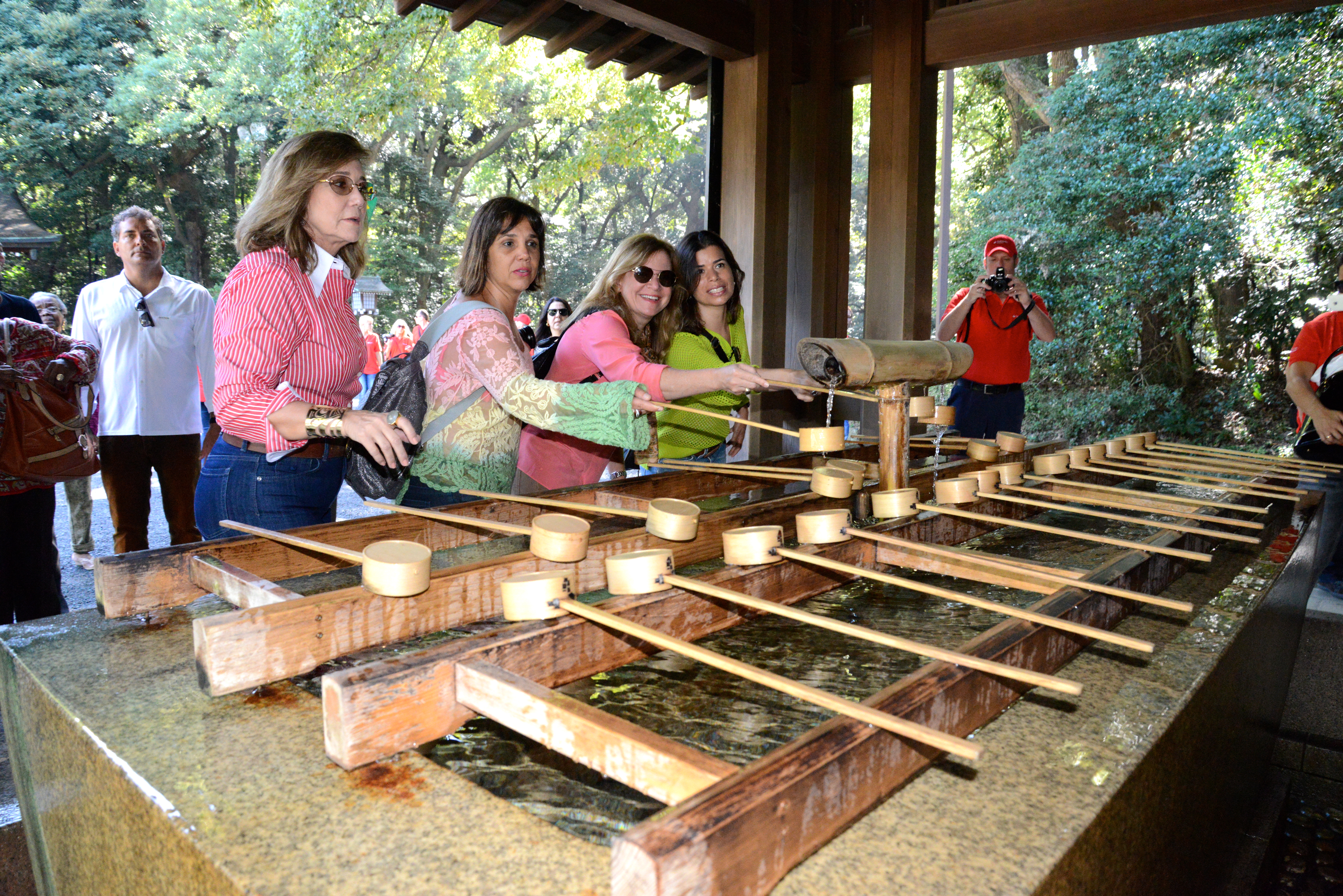Saímos para um City Tour, cuja primeira parada foi no magnífico Santuário Xintoísta Meiji. 80% dos japonese praticam a religião xintoísta, mas ao mesmo tempo são budistas e cristãos. A nossa guia nos ensinou que os japoneses nascem como xintoístas. Casam-se como católicos e morrem como budistas, para aproveitar o que existe de melhor em cada religião.