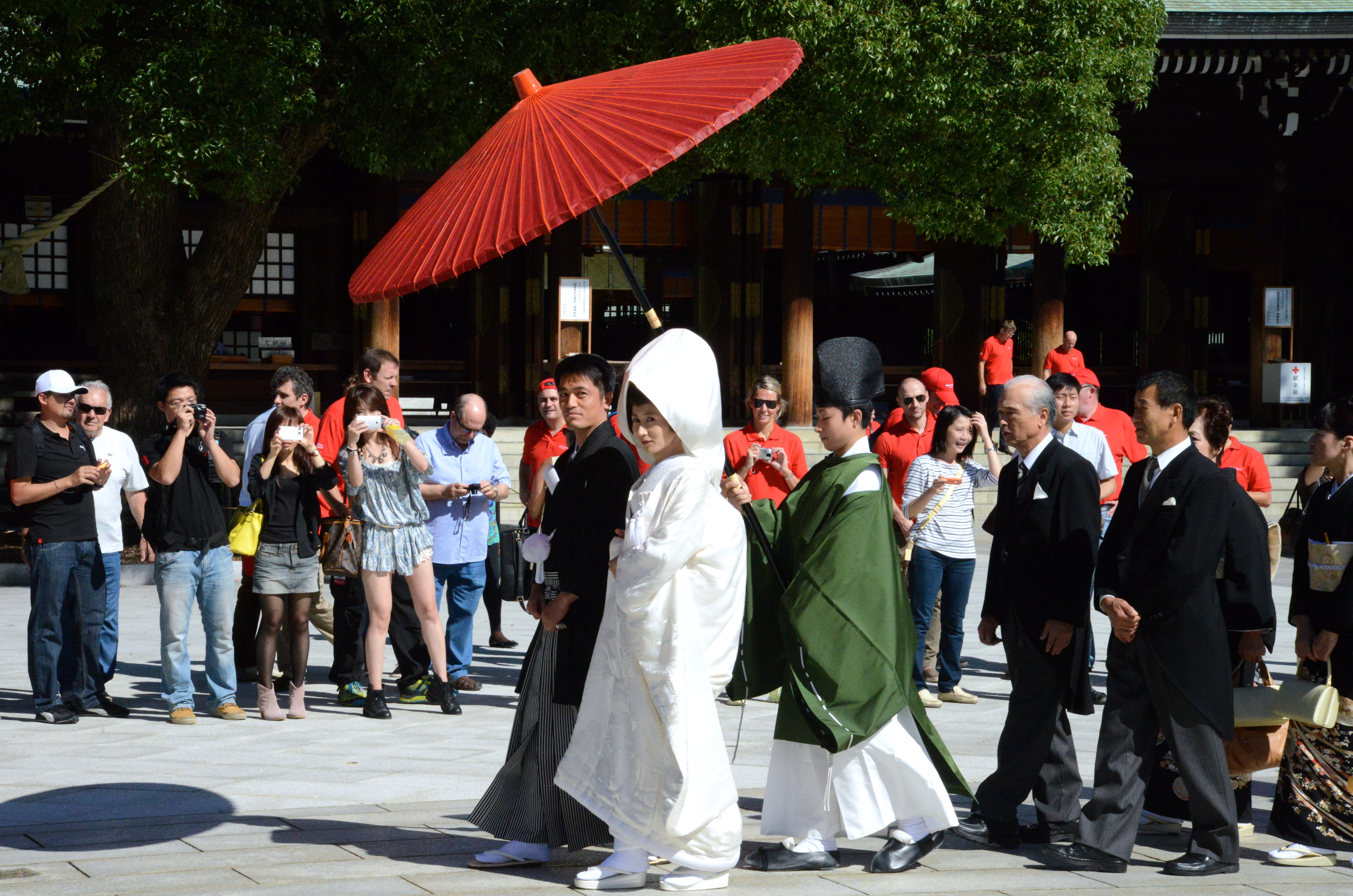 A religião Xintoísta é mais antiga que o budismo e é praticada sobretudo no Japão. É uma religião animista, que cultua os valores da natureza e é formada por uma série de ritos e mitos que explicam a origem do mundo, do Japão e da Família Imperial Japonesa. Tivemos a sorte de assistir a um casamento xintoísta na entrada do templo.
