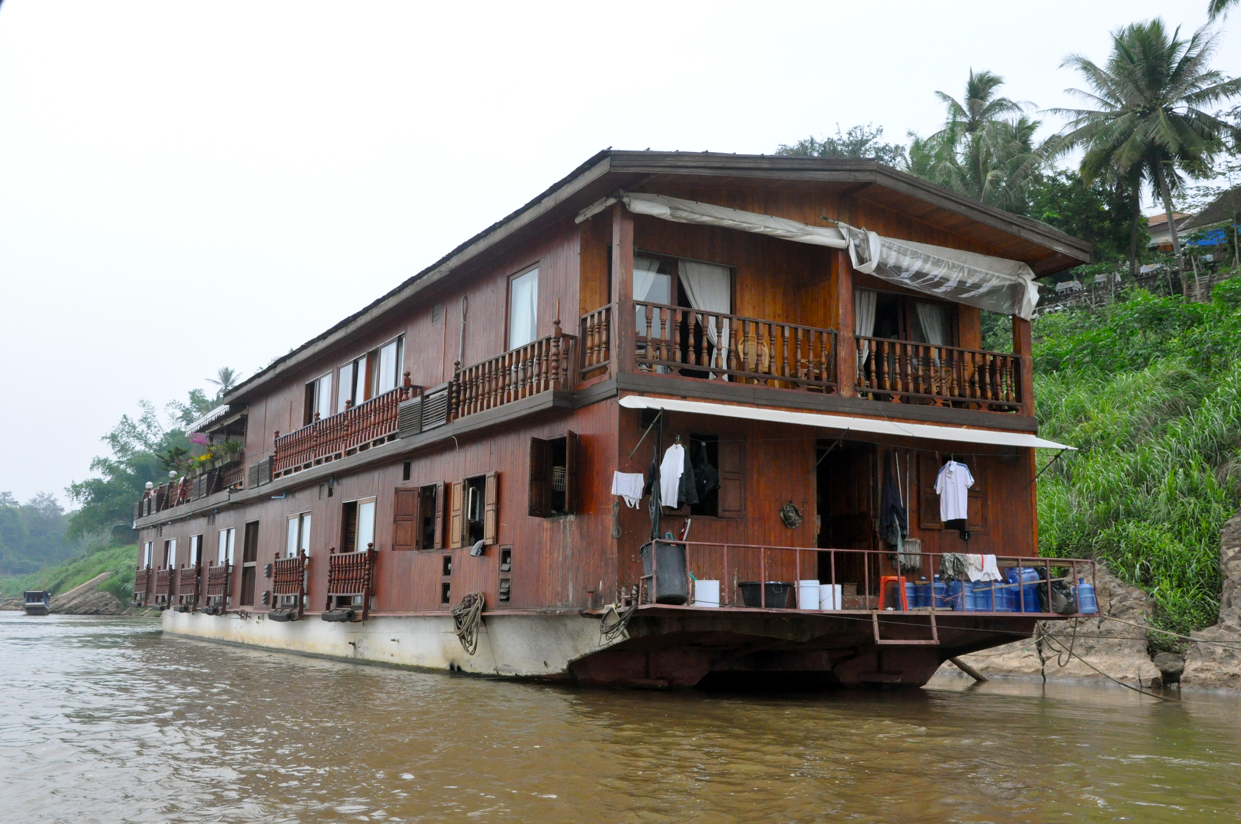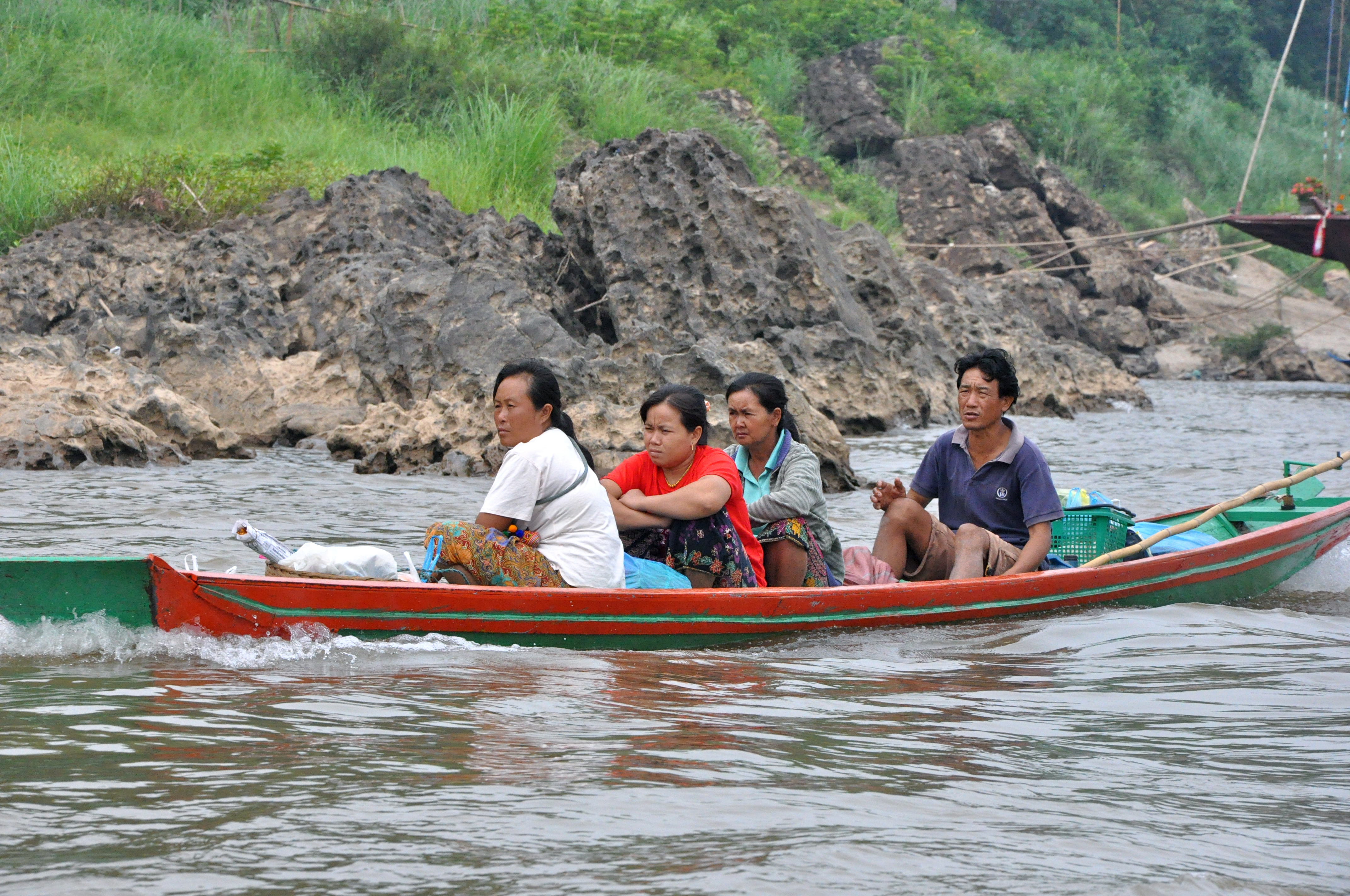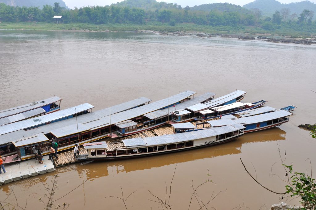 Pela manhã pegamos um tuc-tuc para o porto, alugamos um barco e navegamos no Mekong rio acima, por duas horas até chegarmos às Cavernas Pak Ou. O rio Mekong nasce na China, na região do Tibete e desce em direção à Indochina. Passa pelo Laos, Camboja, Tailândia e deságua no Vietnã, na cidade de Saigon.