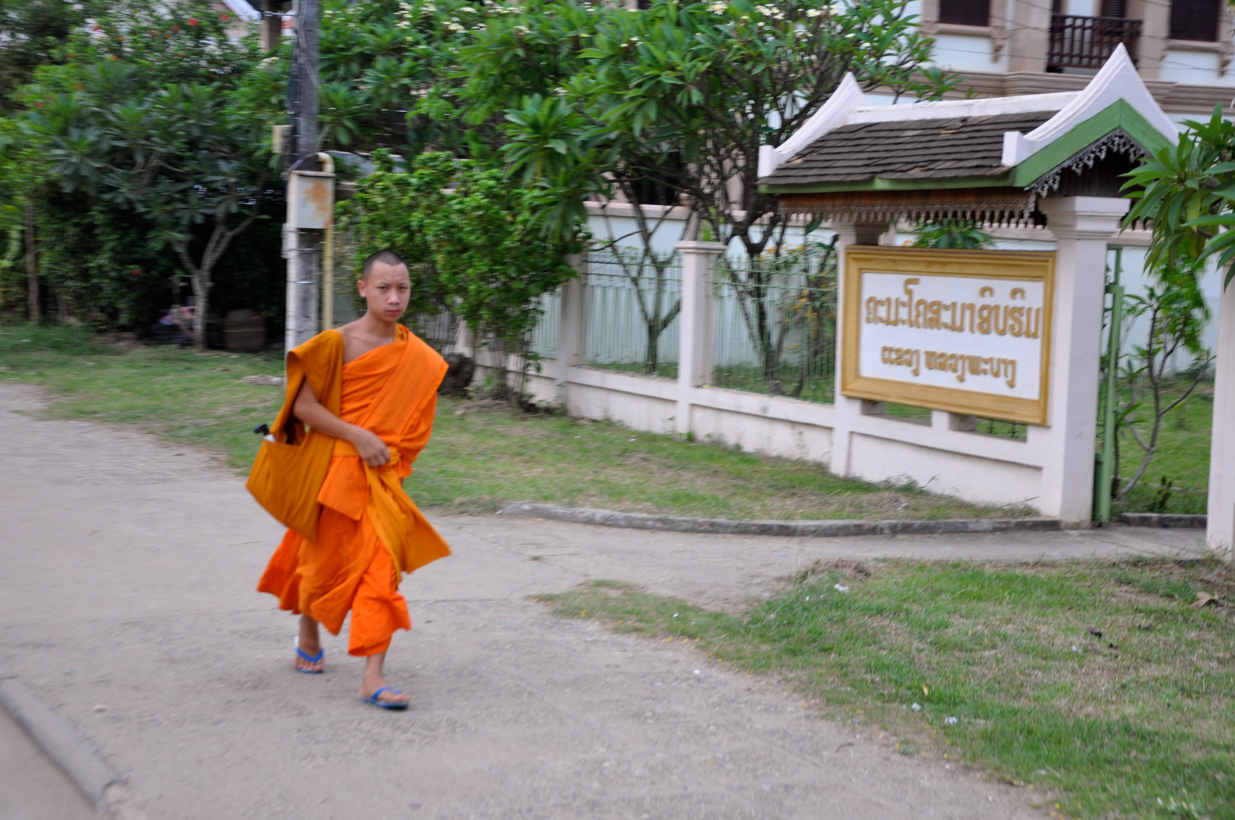 Nas ruas de Luang Prabang é comum nos encontrarmos com centenas de monges e noviços budistas. Os noviços são normalmente recrutados em famílias mais pobres e vão para os mosteiros onde têm a possibilidade de estudar e são amparados socialmente. Quando atingem 20 anos precisam optar sobre continuar ou não a dedicação ao budismo. Caso continuem se tornam monges e passam a ter muitas outras obrigações.