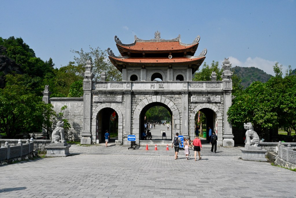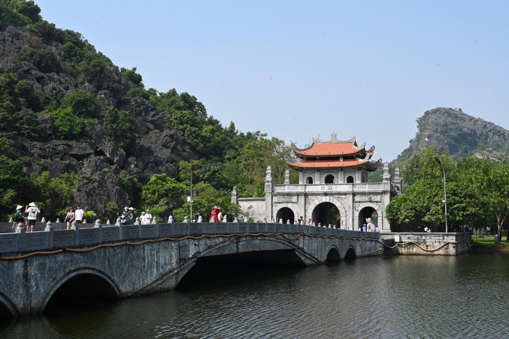 Fizemos uma primeira parada em Hoa Lu, localizada na província de Ninh Binh, foi a primeira capital do Vietnã unificado, entre os séculos X e XI, durante as dinastias Dinh e Le. Cercada por montanhas de calcário, semelhantes às que existem na Baía de Ha Long, que serviam como uma espécie de defesa natural, a antiga cidade real, teve papel decisivo na consolidação do Estado vietnamita e na resistência contra invasões estrangeiras. Hoje, o local é um importante sítio histórico e arqueológico, onde se preservam templos dedicados aos reis Dinh Tien Hoang e Le Dai Hanh, construídos no século XVII sobre as fundações originais da antiga cidadela. O cenário, com seus vales férteis e colinas que circundam a planície, confere ao conjunto uma atmosfera de tranquilidade e reverência.