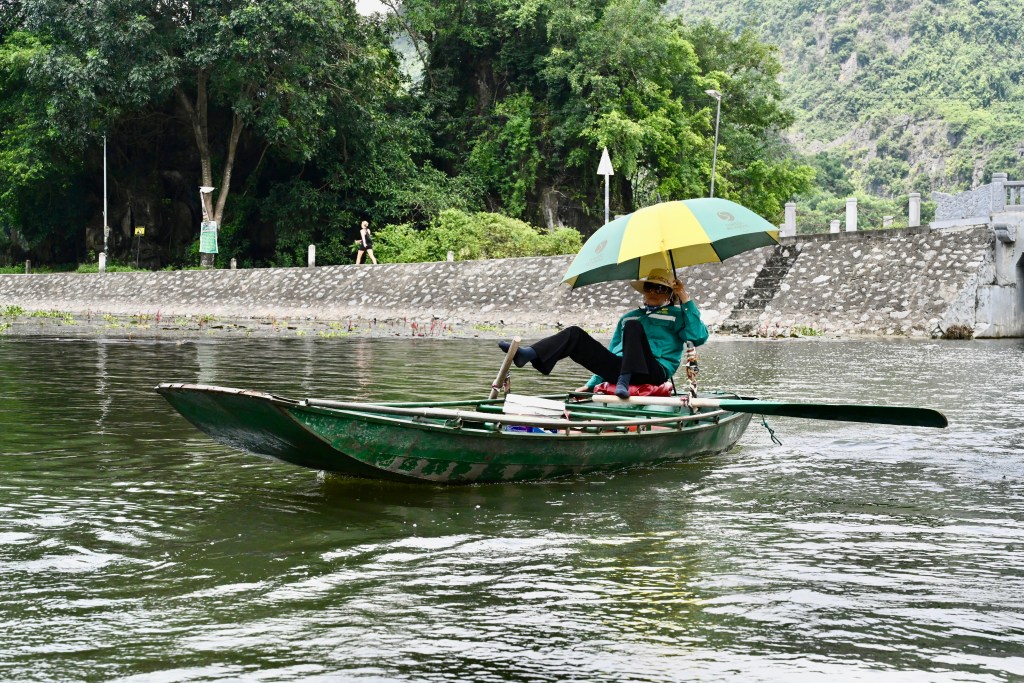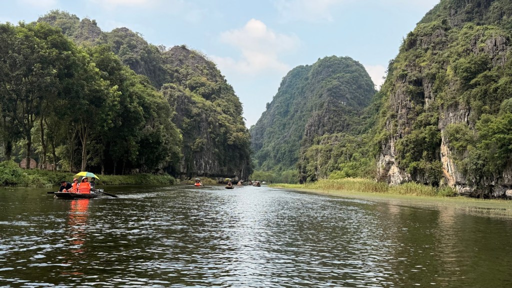 Estávamos seguindo para o Complexo Paisagístico de Tràng An, situado nos arredores de Ninh Binh. É um dos lugares mais fascinantes do Vietnã e foi reconhecido pela UNESCO como Patrimônio Mundial em 2014, tanto por seu valor natural quanto cultural. Conhecido como a “Halong Bay terrestre”, Tràng An é formado por um labirinto de rios e lagos que serpenteiam entre montanhas de calcário cobertas por vegetação densa, cavernas e antigos templos escondidos.