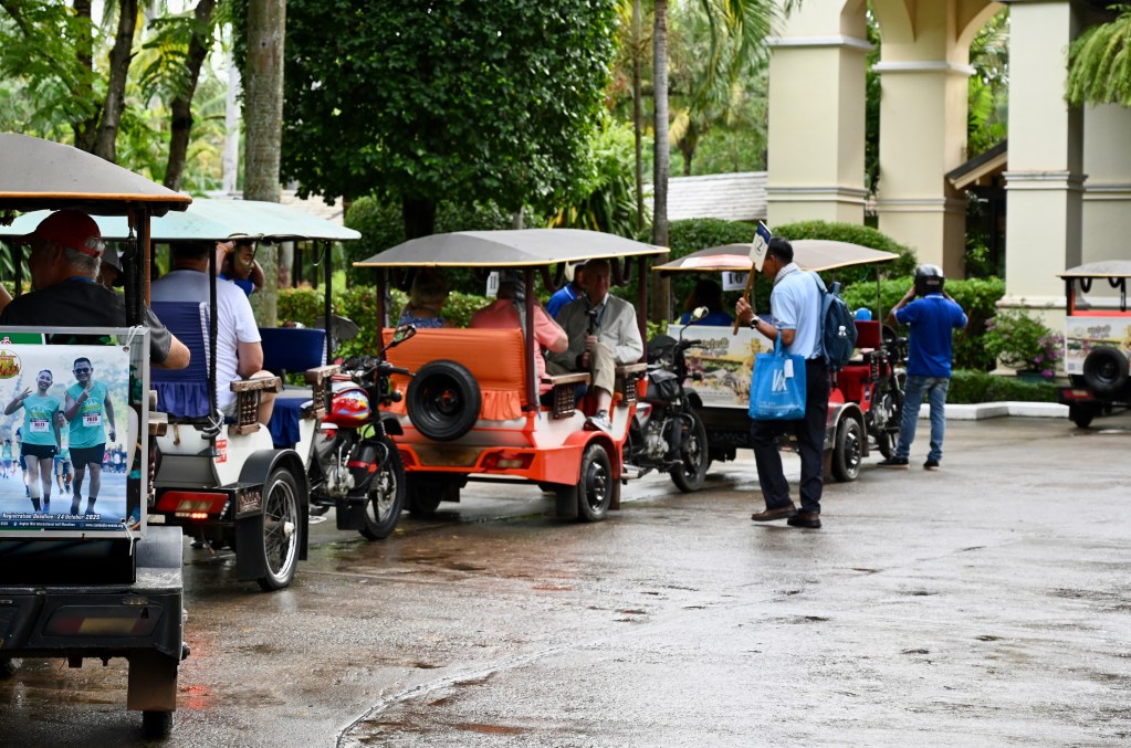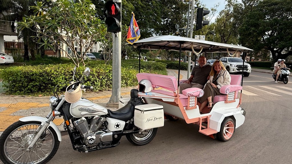 Em seguida continuamos de remork, o meio de transporte mais típico do Camboja. É um reboque coberto, com bancos, acoplado à traseira de uma motocicleta que funciona como motor e direção, algo parecido com um tuk-tuk, mas maior e mais estável. Ele é muito usado em cidades como Siem Reap e Phnom Penh para deslocamentos curtos, passeios turísticos e transfers simples. Por ser aberto e ventilado, oferece uma experiência mais direta da vida local, permitindo observar o trânsito, as ruas e o cotidiano cambojano de forma bastante autêntica.