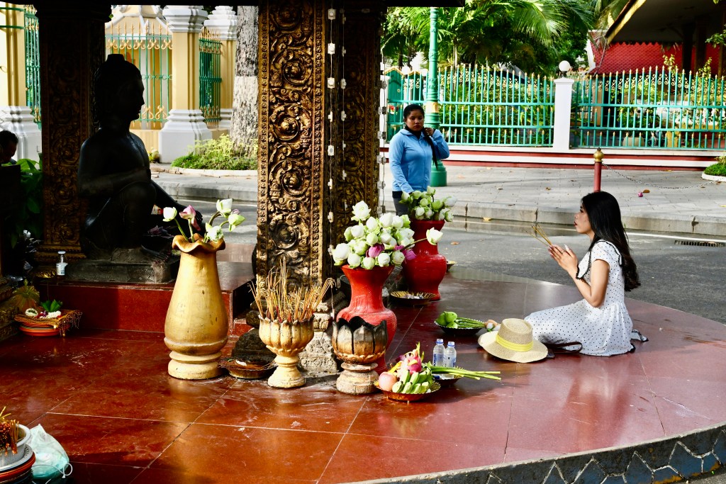 Visitamos um mosteiro local, um espaço importante de prática religiosa no Camboja, onde moradores e visitantes se reúnem para realizar preces voltadas à boa sorte, longevidade e prosperidade. O ambiente segue a rotina típica dos templos budistas do país: fiéis fazem oferendas, acendem incensos e recebem orientações de monges sobre rituais tradicionais. O local funciona como um centro comunitário de caráter espiritual, integrando vida cotidiana, costumes religiosos e atividades culturais. Para quem visita, a passagem pelo mosteiro oferece uma visão direta do papel do budismo na organização social e na vida diária dos cambojanos.