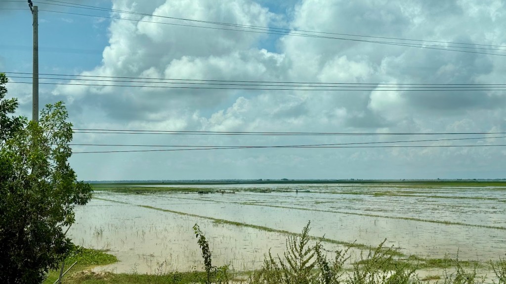 Pela manhã, nos despedimos do Mekong Jewels e seguimos por terra até Siem Reap. Foram 4 horas de viagem de ônibus, por uma estrada simples, mas em boas condições, revelou cenários campestres do interior cambojano, pontuados por campos de arroz, plantações de mandioca, seringueiras e vilarejos na beira da estrada. A chegada da seringueira na região da Indochina e no Camboja, tem uma ligação com o Brasil. Quando a Revolução Industrial explodiu no final do século XVIII, a borracha vegetal passou a ser um item essencial. O seu uso na indústria de máquinas e equipamentos, inclusive na produção de máquinas a vapor passou a ser vital. O único lugar do Mundo onde se produzia borracha vegetal, na época, era no Brasil.