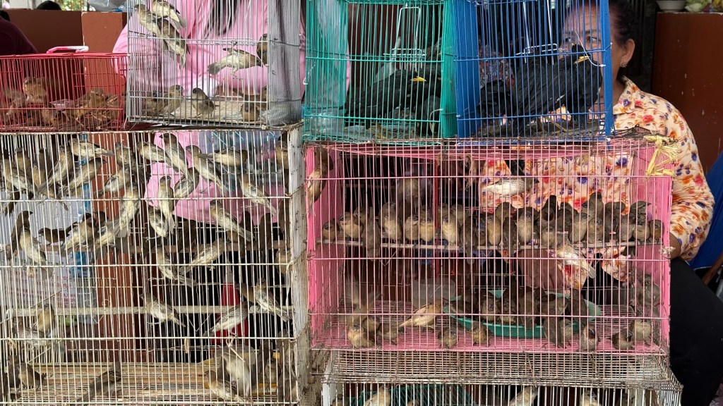 Visitamos o Parque do Palácio Real de Siem Reap, uma área sombreada e tranquila onde árvores imensas abrigam dezenas de morcegos pendurados nos galhos, uma cena curiosa e marcante para quem passa pelo local. Ao lado do parque, funciona uma feira de ambulantes, com comidas típicas, frutas e artesanato. Ali também observamos uma prática comum em algumas regiões da Indochina: o engaiolamento de passarinhos para serem “libertados” por turistas em troca de um dólar. Embora apresentada como um gesto de boa sorte, logo percebemos que faz parte de um ciclo contínuo. Após a soltura, outros garotos surgem com mais passarinhos presos, revelando uma tradição controversa que mistura crença popular, comércio e sobrevivência econômica.